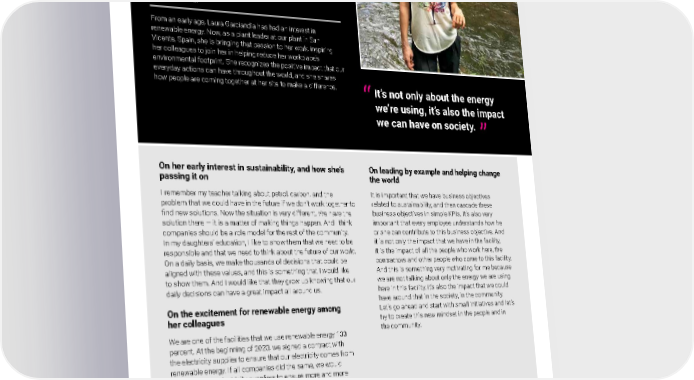 2021 Owens Corning Sustainability Report | Reducing Our Environmental Footprint | Energy Efficiency | 144 SPEAKING OF SUSTAINABILITY From an early age, Laura Garciandia has had an interest in renewable energy. Now, as a plant leader at our plant in San Vicente, Spain, she is bringing that passion to her work, inspiring her colleagues to join her in helping reduce her workplace’s environmental footprint. She recognizes the positive impact that our everyday actions can have throughout the world, and she shares how people are coming together at her site to make a difference. Photo courtesy of Laura Garciandia On her early interest in sustainability, and how she’s passing it on I remember my teacher talking about petrol, carbon, and the problem that we could have in the future if we don’t work together to find new solutions. Now the situation is very different. We have the solution there — it is a matter of making things happen. And I think companies should be a role model for the rest of the community. In my daughters’ education, I like to show them that we need to be responsible and that we need to think about the future of our world. On a daily basis, we make thousands of decisions that could be aligned with these values, and this is something that I would like to show them. And I would like that they grow up knowing that our daily decisions can have a great impact all around us. On the excitement for renewable energy among her colleagues We are one of the facilities that we use renewable energy 100 percent. At the beginning of 2020, we signed a contract with the electricity supplier to ensure that our electricity comes from renewable energy. If all companies did the same, we would be pushing the electricity suppliers to ensure more and more renewable energy — and in the end, we would be changing the world. It is simple, but it is important. Some operators of our facility here in Spain asked me about this process because they wanted to do the same with their electricity at home. I think that those small steps could change the world. On leading by example and helping change the world It is important that we have business objectives related to sustainability, and then cascade these business objectives in simple KPIs. It’s also very important that every employee understands how he or she can contribute to this business objective. And it is not only the impact that we have in the facility, it is the impact of all the people who work here, the contractors and other people who come to this facility. And this is something very motivating for me because we are not talking about only the energy we are using here in this facility, it’s also the impact that we could have around that in the society, in the community. Let’s go ahead and start with small initiatives and let’s try to create this new mindset in the people and in the community. It’s not only about the energy we’re using, it’s also the impact we can have on society. ” “ Laura Garciandia Plant Leader
