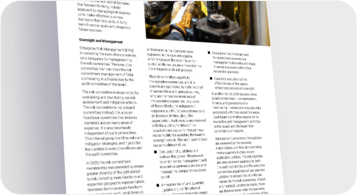 2021 Owens Corning Sustainability Report | Our Approach | Risk Management | 58 OUR APPROACH Oversight and Management Enterprise Risk Management (ERM) is owned by the executive committee, who delegates its management to the risk committee. The executive committee then monitors the risk committee’s management of ERM, culminating in a final review by the audit committee of the board. The risk committee is responsible for overseeing and monitoring our risk assessment and mitigation actions. The risk committee is not a board committee; instead, it is a cross- functional committee that includes members across many areas of expertise. It is also structurally independent of our business lines. This internal group identifies risks and mitigation strategies, and it provides key updates to executive officers and the audit committee. In 2020, the risk committee’s membership was amended to ensure greater diversity of thought related to risk, including more functions and expanded geographic representation. Members from corporate functions include internal audit, legal, treasury, corporate strategy and financial planning, sourcing and supply chain, and IT. They were joined by individuals representing operations, human resources, commercial strategy, and science and technology within the businesses. In addition, safety and environmental concerns were expanded in the core risk register, which increases the extent to which sustainability issues are embedded into the enterprise-wide risk process. The risk committee reports to the executive committee, and it is specifically sponsored by both the chief financial officer and general counsel, who are themselves members of the executive committee. In support of these efforts, the independent corporate audit function systematically addresses risk throughout the organization. Audit results are reviewed with the audit committee of the board of directors, which has primary responsibility for assisting the board’s oversight of risk. The audit committee’s responsibilities include: ■ Discussion of guidelines and policies that govern the process by which senior management and relevant departments access and manage the company’s exposure to risk. ■ Annual review of, and quarterly updates on, identification of Owens Corning’s key risks, major financial exposures, and related mitigation plans. ■ Oversight of our management of the key risks and major financial exposures that fall within the audit committee’s specific purview. Photo submitted by: Jan-Christian Stenroos | Parainen, Finland A Paroc employee inspects plant machinery. ■ Assurance that the board and its committees oversee our management’s key risks and major financial exposures within their respective purviews. ■ Quarterly evaluation of the effectiveness of the above- referenced process of oversight. In addition to the ERM process, three board committees — compensation, finance, and governance and nominating — review and evaluate risks associated with their respective areas. Each board committee reports on its respective risk management activities to the board, and the board then considers such reports. Between annual reviews, the registers are reviewed by the business stakeholders, and the risk committee meets quarterly to discuss any applicable updates. The risk registers are also reviewed quarterly by both the audit committee and the executive committee, regardless of any planned updates, to ensure that no risks are missed by the risk committee. Should any material updates be made, these are then reviewed with the executive committee and audit committee of the board as well. Owens Corning identifies and manages risk across economic, environmental, and social domains. Our forward-thinking, holistic approach to managing risk enables us to make effective business decisions that help us build long- term financial goals and shape our future success.