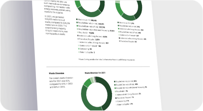 2021 Owens Corning Sustainability Report | Reducing Our Environmental Footprint | Waste Management | 185 Total Waste Generation and Disposal Owens Corning separates waste into hazardous and non-hazardous categories. The majority of waste generated in our facilities is either recycled or sent to landfill. Depending on the type of waste, we also use such methods as commercial composting, incineration with energy recovery, and returning waste to the supplier. In 2021, we generated 920,955 metric tons of waste, compared to 825,256 metric tons in 2020. The overwhelming majority, 916,431 metric tons, was non-hazardous waste. Waste Diversion Our overall waste diversion rate for 2021 was 62%, compared to 64% in 2020 and 60% in 2018. Waste-to-Landfill 343,492 Recycled Internally (on-site) 264,951 Recycled Externally (off-site) 227,715 Recycled Internally with External Processing 51,921 Recultivation 15,854 Incinerated with Energy Recovery 8,506 Treated and Recycled 2,879 Incinerated without Energy Recovery 907 Controlled Confinement* 186 Composting 18 Return to Supplier 2 2021 Non-Hazardous Waste by Disposal Method (Metric Tons) Waste-to-Landfill 1,976 Recycled Internally (on-site) 812 Incinerated with Energy Recovery 664 Recycled Externally (off-site) 495 Controlled Confinement* 217 Incinerated without Energy Recovery 295 Treated and Recycled 65 2021 Hazardous Waste by Disposal Method (Metric Tons) Recycled Internally (on-site) 46% Recycled Externally (off-site) 40% Recycled Internally with External Processing 9% Recultivation 3% Incinerated with Energy Recovery 2% Treated and Recycled 1% Composting <1% Return to Supplier <1% Waste Diversion for 2021 * Owens Corning considers Controlled Confinement as Waste-to-Landfill for reporting purposes.