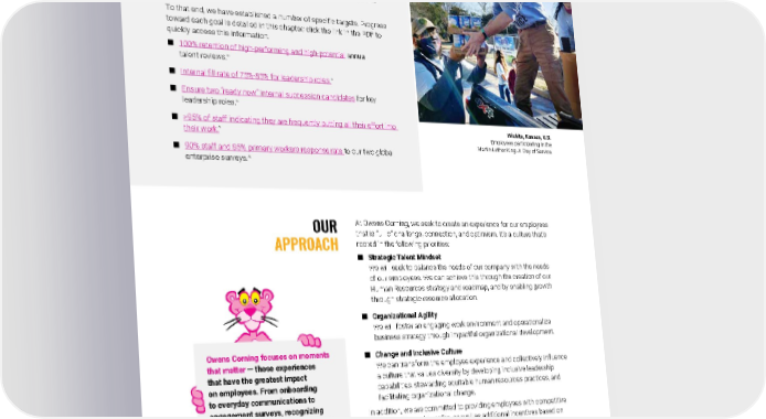 2021 Owens Corning Sustainability Report | Expanding Our Social Handprint | Employee Experience | 202 By 2030, in conjunction with our inclusion and diversity goals, we will make continuous improvements in recruiting, retention, training and development, mentorship and sponsorship, professional growth, and employee engagement. To that end, we have established a number of specific targets. Progress toward each goal is detailed in this chapter; click the link in the PDF to quickly access this information. ■ 100% retention of high-performing and high-potential annual talent reviews. + ■ Internal fill rate of 75%-85% for leadership roles. + ■ Ensure two “ready now” internal succession candidates for key leadership roles. + ■ >95% of staff indicating they are frequently putting all their effort into their work. ^ ■ 90% staff and 85% primary workers response rate to our two global enterprise surveys.^ OUR APPROACH At Owens Corning, we seek to create an experience for our employees that is full of challenge, connection, and optimism. It’s a culture that’s rooted in the following priorities: ■ Strategic Talent Mindset We will seek to balance the needs of our company with the needs of our employees. We can achieve this through the creation of our Human Resources strategy and roadmap, and by enabling growth through strategic resource allocation. ■ Organizational Agility We will foster an engaging work environment and operationalize business strategy through impactful organizational development. ■ Change and Inclusive Culture We can transform the employee experience and collectively influence a culture that values diversity by developing inclusive leadership capabilities, stewarding equitable human resources practices, and facilitating organizational change. In addition, we are committed to providing employees with competitive compensation and benefits, as well as additional incentives based on several factors, including individual and company performance. We align our hiring strategy with local labor markets, especially as we grow outside the U.S. Other programs, such as flexible work arrangements, are designed to help employees maintain a healthy work/life integration. Wichita, Kansas, U.S. Employees participating in the Martin Luther King Jr. Day of Service. 2030 GOALS FOR THE EMPLOYEE EXPERIENCE Owens Corning focuses on moments that matter — those experiences that have the greatest impact on employees. From onboarding to everyday communications to engagement surveys, recognizing the significance of these moments is essential to our approach.