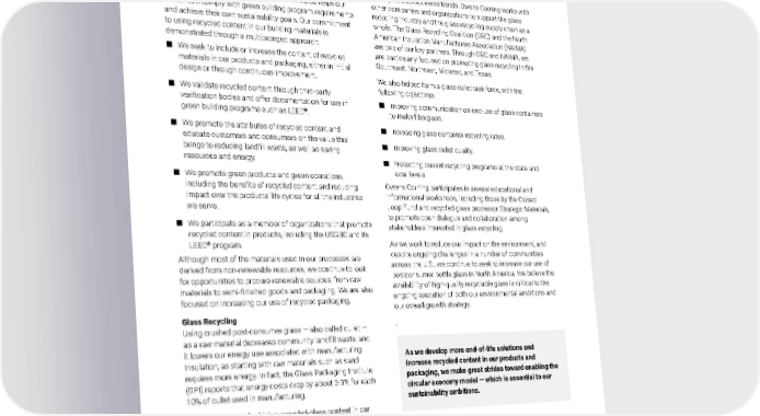 2021 Owens Corning Sustainability Report | Expanding Our Product Handprint | Product Innovation & Stewardship | 104 Product Circularity and Recycled Content Recycled content reduces waste and saves resources throughout our manufacturing operations. It also helps our customers comply with green building program requirements and achieve their own sustainability goals. Our commitment to using recycled content in our building materials is demonstrated through a multipronged approach: ■ We seek to include or increase the content of recycled materials in our products and packaging, either in initial design or through continuous improvement. ■ We validate recycled content through third-party verification bodies and offer documentation for use in green building programs such as LEED ® . ■ We promote the attributes of recycled content and educate customers and consumers on the value this brings to reducing landfill waste, as well as saving resources and energy. ■ We promote green products and green operations, including the benefits of recycled content and reducing impact over the products’ life cycles for all the industries we serve. ■ We participate as a member of organizations that promote recycled content in products, including the USGBC and its LEED ® program. Although most of the materials used in our processes are derived from non-renewable resources, we continue to look for opportunities to procure renewable sources, from raw materials to semi-finished goods and packaging. We are also focused on increasing our use of recycled packaging. Glass Recycling Using crushed post-consumer glass — also called cullet — as a raw material decreases community landfill waste, and it lowers our energy use associated with manufacturing insulation, as starting with raw materials such as sand requires more energy. In fact, the Glass Packaging Institute (GPI) reports that energy costs drop by about 2-3% for each 10% of cullet used in manufacturing. Even as we strive for higher recycled-glass content in our insulation products, the supply of recycled glass is at risk. According to the U.S. Environmental Protection Agency, only 31.3% of all glass containers were recycled in 2018 (the last year for which data have been published). In addition, many U.S. municipalities have removed glass from their curbside recycling programs, further threatening cullet supply. To help counteract these trends, Owens Corning works with other companies and organizations to support the glass recycling industry and the glass recycling supply chain as a whole. The Glass Recycling Coalition (GRC) and the North American Insulation Manufacturers Association (NAIMA) are two of our key partners. Through GRC and NAIMA, we are particularly focused on promoting glass recycling in the Southeast, Northeast, Midwest, and Texas. We also helped form a glass cullet task force, with the following objectives: ■ Improving communication on end-use of glass containers to make fiberglass. ■ Increasing glass container recycling rates. ■ Improving glass cullet quality. ■ Protecting current recycling programs at the state and local levels. Owens Corning participates in several educational and informational workshops, including those by the Closed Loop Fund and recycled glass processor Strategic Materials, to promote open dialogue and collaboration among stakeholders interested in glass recycling. As we work to reduce our impact on the environment, and despite ongoing challenges in a number of communities across the U.S., we continue to seek to increase our use of postconsumer bottle glass in North America. We believe the availability of high-quality recyclable glass is critical to the ongoing execution of both our environmental ambitions and our overall growth strategy. . PRODUCT SUSTAINABILITY & TRANSPARENCY As we develop more end-of-life solutions and increase recycled content in our products and packaging, we make great strides toward enabling the circular economy model — which is essential to our sustainability ambitions.
