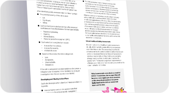 2021 Owens Corning Sustainability Report | Expanding Our Social Handprint | Living Safely | 253 Virtual assessments came about as a result of COVID-19 restrictions, but we expect they will become a more regular part of our processes, as this streamlined experience has proven highly beneficial for both our assessment teams and the sites. Detailed Risk Assessment Owens Corning completes a detailed risk assessment of high-risk conditions within a facility, as well as prior to starting each task. We have developed a risk assessment calculator tool that generates a risk score based on the complex relationships between severity and the hierarchy of controls. In addition to traditional risk assessment calculations, which multiply frequency by severity, we are exploring a new scoring system that removes frequency from our calculations. In doing so, we can avoid situations in which a minor but common hazard might be scored higher than one that is more serious but less common. This is in keeping with our commitment to SIF prevention. After identifying a risk, assessors take the following steps: ■ The potential severity of the risk is rated: • SIF. • Significant. • Minor. ■ Each control type is rated according to the assessors’ confidence in their effectiveness. Control types include: • Passive engineering. • Warning. • Administrative. • Personal protective equipment (PPE). ■ Each selection is weighted and scored: • A score for the controls. • A score for severity. • A total risk score. ■ Based on the scores, the risk is categorized: • Low. • Acceptable. • Unacceptable. • Dangerous. If the risk is categorized as unacceptable or dangerous, a mitigation plan is required. When incidents do occur, an investigation into the root causes is conducted. Developing and Sharing Action Plans Each site develops action plans to eliminate or reduce its top risks. ■ Internal teams conduct site assessments that contribute to the enterprise risk management assessments that are completed for the audit committee and the board of directors. ■ Business unit managers regularly discuss work-related risks. ■ These discussions are then shared among our EHS teams, the executive management team, and the board of directors on a quarterly basis, resulting in additional action plans for the entire organization. ■ Quarterly formal business-unit reviews of our safety model are then used to develop a continuous improvement program. ■ Our regional leaders conduct periodic plant inspections as well as provide support and growth opportunities to each of their plants. In some cases, regional leaders collaborate across divisions to help eliminate hazards. ■ The EHS assessment team thoroughly reviews EHS processes at sites, typically on a four- to five-year cycle. We review the list of sites regularly and schedule assessments based on the time elapsed since their last assessment (or sites that have not yet been assessed), site risk, and special requests from the businesses. When required by our customers, we also obtain third-party safety certifications, such as OHSAS 18001/ISO 45001, which cover approximately 25% of our sites. Our global safety and environmental organization verifies and documents the status of management systems during scheduled audits. After assessments are completed, we obtain a published report. All items identified for improvement in the report are incorporated into the facility improvement plan. Critical items are called out and directed to the vice presidents of sustainability and operations for review, and to senior EHS leaders for further action. Virtual Health and Safety Assessments We continue to conduct health and safety assessments virtually, which has led to greater efficiency as assessors spend less time on-site. The process begins as the site answers a series of questions related to safety initiatives and protocols. Assessors then review these self-assessments prior to an on-site visit, and they check up on a sampling of responses to confirm the information matches the assessment. This has led to significant improvements in efficiency, as on-site visits that once took up to a week can be done in a fraction of the time.