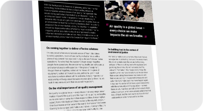 2021 Owens Corning Sustainability Report | Reducing Our Environmental Footprint | Air Quality Management | 163 SPEAKING OF SUSTAINABILITY Devlin Whiteside Environmental Leader With her background in chemical engineering and environmental consulting, Devlin Whiteside has a long-standing interest in how companies address issues of air quality management. She recalls being particularly fascinated by air dispersion modeling, a computer-based model that predicts how pollutants might disperse into the air and get distributed around the globe. Now, as an environmental lead for our Roofing business, Devlin is a strong proponent for environmental justice, the idea that no population should be disproportionately affected by negative environmental impacts, and all populations should be empowered to make informed decisions and take action. Here, she talks about what environmental justice means for Owens Corning and for herself. Air quality is a global issue — every choice we make impacts the air we breathe. ” “ Photo courtesy of Devlin Whiteside On coming together to deliver effective solutions I’m very proud when we collaborate across different disciplines to solve a problem. In one of our plants, we had an issue with a piece of equipment that was continuing to deviate from our normal operations. To solve that, the leadership team brought together people from operations, the environmental, health, and safety group, and external people with expertise in this piece of equipment. We got them all together, looked at the history of this piece of equipment, looked at the root causes, and came up with real solutions to reduce almost all the problems. It really improved our relationship with regulators because we were able to show that we took it very seriously and that we solved the problem. On the vital importance of air quality management Air quality is a global issue — every choice that every single person makes impacts the quality and the health of the air that we breathe, so no one can run away from their responsibilities. Everyone plays a part, from individuals and their choices to the way industries run their businesses and all around the world. It’s important for Owens Corning to do our part and make sure that we understand that the things that we do affect not only our local community, but our entire globe. And since we are a global company, it makes total sense that we would have global, enterprise-wide goals to make sure that we have consistent awareness and progress and goals to reduce our impacts. On building trust in the context of environmental justice We have to make sure our communities trust that we are a partner in protecting them and the environment. My role is to make sure that we are forthcoming, and part of that is building trust with regulators and providing the community with accurate, truthful, relevant information. This means doing things like reporting when we have deviations, so we can show that we are taking these issues very seriously and that we are putting in the preventive measures and action items to make sure they never happen again. It has been to our benefit to have a good relationship with the community and the regulators — to meet them on a human level and talk to them about what’s actually going on, when we’ve already established that level of trust. And the best way to build any kind of relationship is to be honest and to be clear.