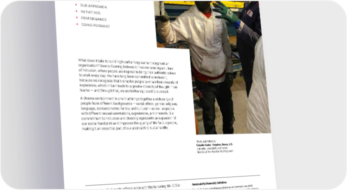 2021 Owens Corning Sustainability Report | Expanding Our Social Handprint | Inclusion & Diversity | 216 INCLUSION & DIVERSITY In this chapter: ƒ 2030 GOALS ƒ OUR APPROACH ƒ INITIATIVES ƒ PERFORMANCE ƒ GOING FORWARD What does it take to build high-performing teams throughout an organization? Owens Corning believes it involves creating a culture of inclusion, where people are inspired to bring their authentic selves to work every day. We have long been committed to inclusion, because we recognize that it enables people to share their diversity of experience, which in turn leads to a greater diversity of thought in our teams — and through that, we are better equipped to succeed. A diverse environment is one that brings together a wide range of people from different backgrounds — racial, ethnic, gender, religious, language, socioeconomic, family, and cultural — as well as people with different sexual orientations, experiences, and interests. Our commitment to inclusion and diversity represents an expansion of our social handprint as it improves the quality of life for our people, making it an essential part of our approach to sustainability. Our inclusion & diversity efforts align with the following UN SDGs: Sustainability Materiality Definition: We aim to foster an inclusive and diverse environment, one which represents a range of people with various racial, ethnic, gender, religious, language, socioeconomic, family, and cultural backgrounds and different sexual orientations, experiences and interests, engaged and working together to create a fair, healthy, and high-performing organization. Inclusion enables employees to feel valued, understood, and inspired to bring their whole selves to work. The social data in this chapter marked with a + sign were independently assured to a moderate level by SCS Global Services. For more information on the assurance process see About the Report , and for our verification statement please see Appendix F . Photo submitted by: Claudia Cantu | Houston, Texas, U.S. Kenyatta Lewis (left) and Kenny Murphy at the Houston Roofing plant.
