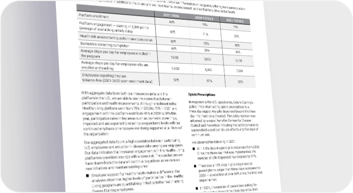 2021 Owens Corning Sustainability Report | Expanding Our Social Handprint | Health & Wellness | 270 We continue to track our employees’ metrics as they relate to their health and well-being. Through the aggregate data we receive, we are best equipped to provide wellness programs that meet the specific needs of our people. HEALTH & WELLNESS PERFORMANCE Metrics Dashboards Our metrics dashboards track our facilities’ success and provide up-to-date information on programs, offering transparency about our healthy living efforts. In addition to the pillars and wellness teams, we implement policies that help drive better health. 2021 GOAL 2020 TOTALS 2021 TOTALS Platform enrollment 80% 78% 73% Platform engagement — earning >12,000 points (average of available quarterly data) 60% 41% 39% Health risk assessment questionnaire completion 60% 53% 48% Biometrics screening completion 60% 38% 40% Average steps per day for employees enrolled in the program 5,000 3,623 3,130 Average steps per day for employees who are enrolled and tracking 9,000 8,083 7,989 Employees reporting they are tobacco-free (2021-2022 open enrollment data) 90% 87% 82% With aggregate data from both our insurance carrier and the platform in the U.S., we are able to see the connection between participation and health improvements. Although enrollment in the Healthy Living platform went from 78% in 2020 to 73% in 2021 and engagement with the platform went from 41% in 2020 to 39% this year, participation rates in key areas such as biometric screenings, improved and are expected to return to pre-pandemic levels with our continued emphasis on employee well-being supported at all levels of the organization. Our aggregated data found a high correlation between participating U.S. employees and reduction in disease risks among our employees. Our data indicates that increased engagement with the Healthy Living platform is correlated strongly with a lower risk. The conclusions we have drawn from this data will continue to guide us as we develop new initiatives and maintain existing ones: ■ Employer support for healthy habits makes a difference. Our analyses show that higher levels of participation in the Healthy Living program are quantitatively linked to better health among Owens Corning employees. ■ Better biometrics correlate strongly with better (lower) health risk scores. ■ Higher participant points (top 20% of participants) correlate strongly with better (lower) sample health risk scores. ■ Higher points-based participation measures (top 20% of participants) are strongly related to smaller increases in risk score, BMI, and blood glucose over time. Opioid Prescriptions In response to the U.S. opioid crisis, Owens Corning’s policy limits short-acting opioid prescriptions to a three-day supply. Any pills dispensed beyond the three- day limit must be authorized. This policy decision was informed by a report from the Centers for Disease Control and Prevention indicating that addiction rates to a prescribed opioid can double after four to five days of continued use. We observed the following in 2021: ■ An 11.8% drop in opioid pills dispensed from 2020. Since the three-day limit was implemented, the number of pills dispensed has dropped by 57%. ■ There was a 15% drop in pills dispensed on prescriptions longer than three days compared to 2020 — a reduction of over 50% since the limit was implemented. ■ In 2021, the number of prescribers asking for authorization beyond the three-day initial limit decreased by 1.3%.