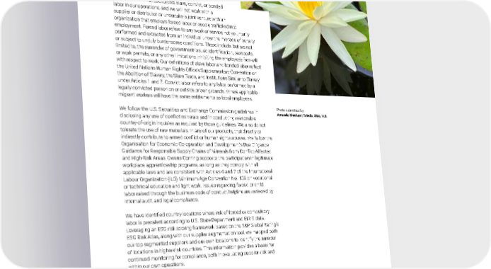 2021 Owens Corning Sustainability Report | Expanding Our Social Handprint | Human Rights & Ethics | 276 ■ Child Labor/Forced Labor We do not employ child labor in our operations. We define child labor as work or service extracted from anyone under the age of 16, the minimum age for employment, or the age for completing education in a country, whichever is highest. We also will not knowingly engage with a supplier or distributor or enter into a joint venture with an organization that does, directly or indirectly. Similarly, we do not use forced, slave, convict, or bonded labor in our operations, and we will not work with a supplier or distributor or undertake a joint venture with an organization that employs forced labor or people trafficked into employment. Forced labor refers to any work or service not voluntarily performed and extracted from an individual under the menace of penalty or subject to unduly burdensome conditions. These include, but are not limited to, the surrender of government-issued identification, passports, or work permits, or any other limitations inhibiting the employee’s free will with respect to work. Our definitions of slave labor and bonded labor reflect the United Nations Human Rights Office’s Supplementary Convention on the Abolition of Slavery, the Slave Trade, and Institutions Similar to Slavery under Articles 1 and 7. Convict labor refers to any labor performed by a legally convicted person on or outside prison grounds. Where applicable, migrant workers will have the same entitlements as local employees. We follow the U.S. Securities and Exchange Commission guidelines in disclosing any use of conflict minerals and in conducting reasonable country-of-origin inquiries as required by those guidelines. We also do not tolerate the use of raw materials, in any of our products, that directly or indirectly contribute to armed conflict or human rights abuses. We follow the Organisation for Economic Co-operation and Development’s Due Diligence Guidance for Responsible Supply Chains of Minerals from Conflict-Affected and High-Risk Areas. Owens Corning supports the participation in legitimate workplace apprenticeship programs, as long as they comply with all applicable laws and are consistent with Articles 6 and 7 of the International Labour Organization (ILO) Minimum Age Convention No. 138 on vocational or technical education and light work. Issues regarding forced or child labor raised through the business code of conduct helpline are reviewed by internal audit and legal compliance. We have identified country locations where risk of forced or compulsory labor is prevalent according to U.S. State Department and EIRIS data. Leveraging an ESG risk scoring framework based on the S&P Global Rating’s ESG Risk Atlas, along with our supplier segmentation tool, we mapped both our top segmented suppliers and our own locations to identify the number of locations in higher-risk countries. This information provides a basis for continued monitoring for compliance, both in evaluating supplier risk and within our own operations. Through our annual survey, no cases of forced, compulsory, or child labor were identified or reported in 2021, nor were human rights risks discovered that required remediation. Due to the nature of the mineral mining industry, we canvass suppliers in that industry to inquire about forced labor issues. When we become aware of an issue in our supply chain, Owens Corning is committed to working with our suppliers to mitigate known or suspected risks. This remains a focus area on annual surveys. Photo submitted by: Amanda Meehan | Toledo, Ohio, U.S.