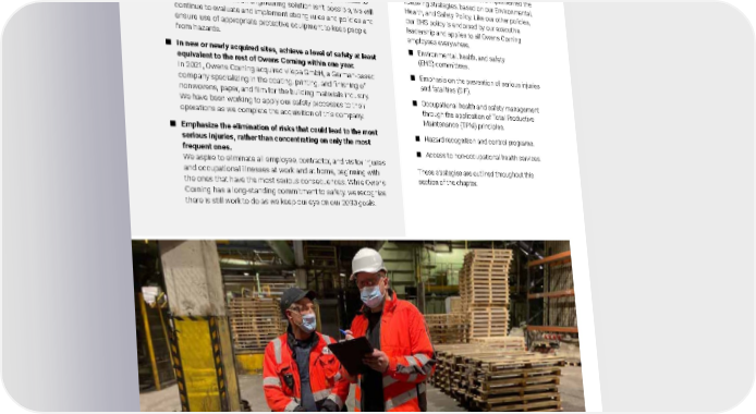 2021 Owens Corning Sustainability Report | Expanding Our Social Handprint | Living Safely | 247 By 2030, we aspire to achieve the following goals: ■ Make it impossible for injuries and illnesses to occur. Ideally, we will do this by designing equipment and processes to eliminate risk. When an engineering solution isn’t possible, we will continue to evaluate and implement strong rules and policies and ensure use of appropriate protective equipment to keep people from hazards. ■ In new or newly acquired sites, achieve a level of safety at least equivalent to the rest of Owens Corning within one year. In 2021, Owens Corning acquired vliepa GmbH, a German-based company specializing in the coating, printing, and finishing of nonwovens, paper, and film for the building materials industry. We have been working to apply our safety processes to their operations as we complete the acquisition of this company. ■ Emphasize the elimination of risks that could lead to the most serious injuries, rather than concentrating on only the most frequent ones. We aspire to eliminate all employee, contractor, and visitor injuries and occupational illnesses at work and at home, beginning with the ones that have the most serious consequences. While Owens Corning has a long-standing commitment to safety, we recognize there is still work to do as we keep our eye on our 2030 goals. OUR APPROACH As we work to achieve zero accidents and injuries at our facilities, we have implemented the following strategies, based on our Environmental, Health, and Safety Policy. Like our other policies, our EHS policy is endorsed by our executive leadership and applies to all Owens Corning employees everywhere. ■ Environmental, health, and safety (EHS) committees. ■ Emphasis on the prevention of serious injuries and fatalities (SIF). ■ Occupational health and safety management through the application of Total Productive Maintenance (TPM) principles. ■ Hazard recognition and control programs. ■ Access to non-occupational health services. These strategies are outlined throughout this section of the chapter. Photo submitted by: Tadas Narankevicius | Vilnius, Lithuania L2 operator Stanislav Koščic (left) and warehouse manager Artūras Riška (right) engage on a gemba walk to ensure quality. 2030 GOALS FOR LIVING SAFELY