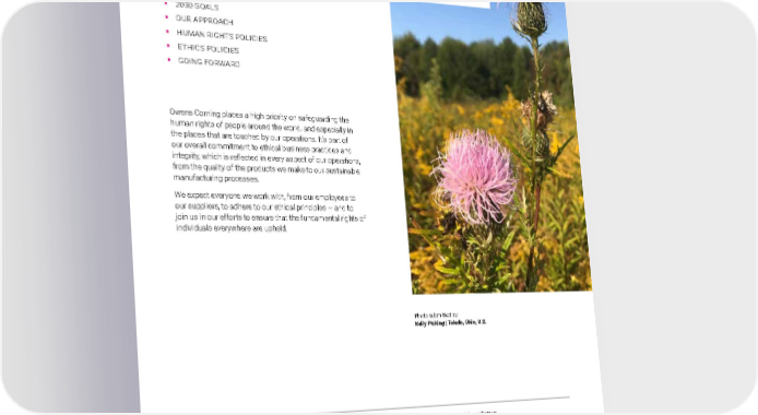 2021 Owens Corning Sustainability Report | Expanding Our Social Handprint | Human Rights & Ethics | 273 Our human rights & ethics efforts align with the following UN SDGs: Sustainability Materiality Definition: Owens Corning has the privilege of working with people all over the world. We believe that this privilege comes with the responsibility to treat all people with dignity and respect and to protect their fundamental rights. We are committed to setting and upholding the highest standards for safeguarding human rights in everything we do. The social data in this chapter marked with a + sign were independently assured to a moderate level by SCS Global Services. For more information on the assurance process see About the Report, and for our verification statement please see Appendix F . HUMAN RIGHTS & ETHICS In this chapter: ƒ 2030 GOALS ƒ OUR APPROACH ƒ HUMAN RIGHTS POLICIES ƒ ETHICS POLICIES ƒ GOING FORWARD Owens Corning places a high priority on safeguarding the human rights of people around the world, and especially in the places that are touched by our operations. It’s part of our overall commitment to ethical business practices and integrity, which is reflected in every aspect of our operations, from the quality of the products we make to our sustainable manufacturing processes. We expect everyone we work with, from our employees to our suppliers, to adhere to our ethical principles — and to join us in our efforts to ensure that the fundamental rights of individuals everywhere are upheld. Photo submitted by: Kelly Picking | Toledo, Ohio, U.S.