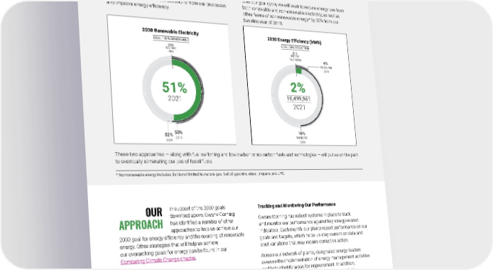 2021 Owens Corning Sustainability Report | Reducing Our Environmental Footprint | Energy Efficiency | 138 By 2030, we will be sourcing 100% renewable electricity. Purchasing electricity only from renewable sources is a key part of our effort to halve our greenhouse gas emissions. We’ll also work to reduce the emissions from our processes and improve energy efficiency. We will also reduce energy use by 20% over our baseline year. Over our goal cycle, we will work to reduce energy use from both renewable and non-renewable electricity, as well as other forms of non-renewable energy* by 20% from our baseline year of 2018. These two approaches — along with fuel switching and low-carbon or no-carbon fuels and technologies — will put us on the path to eventually eliminating our use of fossil fuels. * Non-renewable energy includes, but is not limited to, natural gas, fuel oil, gasoline, diesel, propane, and LPG. 2030 GOALS FOR ENERGY EFFICIENCY & SOURCING RENEWABLE ENERGY OUR APPROACH In support of the 2030 goals described above, Owens Corning has identified a number of other approaches to help us achieve our 2030 goal for energy efficiency and the sourcing of renewable energy. Other strategies that will help us achieve our overarching goals for energy can be found in our Combating Climate Change chapter . Tracking and Monitoring Our Performance Owens Corning has robust systems in place to track and monitor our performance against key energy-related indicators. Each month, our plants report performance on our goals and targets, which helps us stay current on data and spot variations that may require corrective action. Across our network of plants, designated energy leaders oversee the implementation of energy management activities and help identify areas for improvement. In addition, Owens Corning has energy managers who conduct assessments, facilitate Kaizen and Total Productive Maintenance activities, develop projects, and provide technical support. Several plants with medium and high energy usage also have energy teams that meet monthly. 2030 Energy Efficiency (MWh) GOAL: 20% REDUCTION 2030 Renewable Electricity GOAL: 100% R ENEWABLE 51% 2021 201 8 BASE YEAR 48% 50% 2019 52% 2020 2% 10,499,961 2021 201 8 BASE YEAR 10,719,236 4% 10,274,193 2019 10% 9,658,731 2020