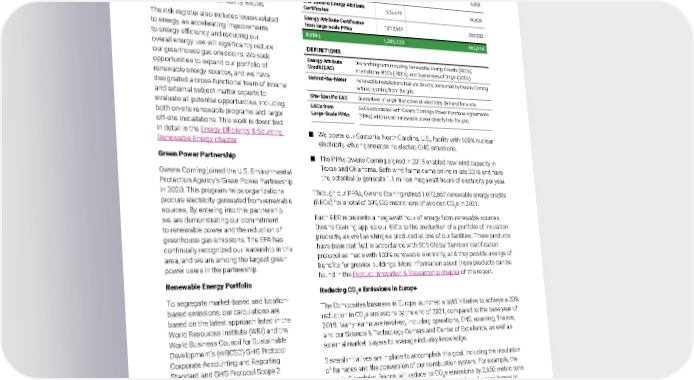 2021 Owens Corning Sustainability Report | Reducing Our Environmental Footprint | Combating Climate Change | 152 CLIMATE CHANGE INITIATIVES We include climate change in our risk register, enabling our business units and risk committee to facilitate strategic and operational planning processes as we mitigate potential sustainability issues. The risk register also includes issues related to energy, as accelerating improvements to energy efficiency and reducing our overall energy use will significantly reduce our greenhouse gas emissions. We seek opportunities to expand our portfolio of renewable energy sources, and we have designated a cross-functional team of internal and external subject matter experts to evaluate all potential opportunities, including both on-site renewable programs and larger off-site installations. This work is described in detail in the Energy Efficiency & Sourcing Renewable Energy chapter . Green Power Partnership Owens Corning joined the U.S. Environmental Protection Agency’s Green Power Partnership in 2020. This program helps organizations procure electricity generated from renewable sources. By entering into this partnership, we are demonstrating our commitment to renewable power and the reduction of greenhouse gas emissions. The EPA has continually recognized our leadership in this area, and we are among the largest green power users in the partnership. Renewable Energy Portfolio To segregate market-based and location- based emissions, our calculations are based on the latest approach listed in the World Resources Institute (WRI) and the World Business Council for Sustainable Development’s (WBCSD) GHG Protocol Corporate Accounting and Reporting Standard and GHG Protocol Scope 2 Guidance for segregation. In support of our efforts to reduce our GHG emissions, Owens Corning has expanded its renewable energy portfolio. The following are a few of our renewable energy initiatives. More information about our commitment to renewable energy can be found in the Energy Efficiency & Sourcing Renewable Energy chapter . ■ In 2021, we sourced 224,476 MWh of electricity through guarantees of origin for renewable electricity across 11 of our European sites, which translated to 56,828 metric tons of avoided CO 2 e. ■ We power our Gastonia, North Carolina, U.S., facility with 100% nuclear electricity, which generates no electric GHG emissions. ■ The PPAs Owens Corning signed in 2015 enabled new wind capacity in Texas and Oklahoma. Both wind farms came online in late 2016 and have the potential to generate 1.1 million megawatt hours of electricity per year. Through our PPAs, Owens Corning retired 1,072,667 renewable energy credits (RECs) for a total of 399,932 metric tons of avoided CO 2 e in 2021. Each REC represents a megawatt hour of energy from renewable sources. Owens Corning applies our RECs to the production of a portfolio of insulation products, as well as shingles produced at one of our facilities. These products have been certified in accordance with SCS Global Services’ certification protocol as made with 100% renewable electricity, and they provide a range of benefits for greener buildings. More information about these products can be found in the Product Innovation & Stewardship chapter of this report. Reducing CO 2 e Emissions in Europe The Composites business in Europe launched a bold initiative to achieve a 20% reduction in CO 2 e emissions by the end of 2021, compared to the base year of 2018. Many teams are involved, including operations, EHS, sourcing, finance, and our Science & Technology Centers and Center of Excellence, as well as external market players to leverage industry knowledge. Several initiatives are in place to accomplish this goal, including the insulation of furnaces and the conversion of our combustion system. For example, the plant in Chambéry, France, will reduce its CO 2 e emissions by 2,650 metric tons per year by 2022, thanks to using the heat recovered from furnace fumes in our dryers. At our plant in Apeldoorn, Netherlands, the equipment used to dry the glass veil uses approximately 10 million cubic meters of natural gas each year. To reduce the CO 2 e emissions that go along with that level of natural gas use, a project team there has started a Kaizen to identify opportunities to reduce consumption through process improvements. In addition, the team is researching possible sources of alternative energy to power the dryers. 2021 Renewable Programs GHG Reductions by Type MW h EMISSIONS REDUCTION, IN MT CO 2 e Behind-the-Meter Renewable Installations 88,190 6,858 Site-specific Energy Attribute Certificates 224,476 56,828 Energy Attribute Certificates from large-scale PPAs 1,072,667 399,932 TOTAL 1,385,333 463,618 DEFINITIONS Energy Attribute Credit (EAC) Overarching term including Renewable Energy Credits (RECs), International RECs (IRECs), and Guarantees of Origin (GOOs). Behind-the-Meter Renewable installations that are directly consumed by Owens Corning without coming from the grid. Site-Specific EAC Guarantees of origin that cover all electricity demand for a site. EACs from Large-Scale PPAs EACs associated with Owens Corning’s Power Purchase Agreements (PPAs) which inject renewable power directly into the grid.