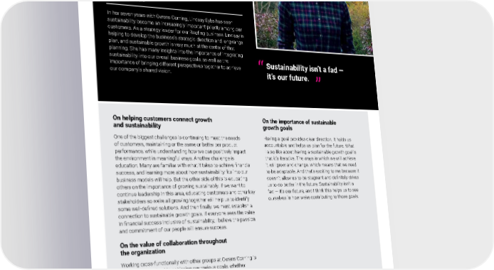 2021 Owens Corning Sustainability Report | Expanding Our Product Handprint | Sustainable Growth | 116 SPEAKING OF SUSTAINABILITY In her seven years with Owens Corning, Lindsay Eybs has seen sustainability become an increasingly important priority among our customers. As a strategy leader for our Roofing business, Lindsay is helping to develop the business’s strategic direction and long-range plan, and sustainable growth is very much at the center of that planning. She has many insights into the importance of integrating sustainability into our overall business goals, as well as the importance of bringing different perspectives together to achieve our company’s shared vision. Photo courtesy of Lindsay Eybs On helping customers connect growth and sustainability One of the biggest challenges is continuing to meet the needs of customers, maintaining or the same or better per product performance, while understanding how we can positively impact the environment in meaningful ways. Another challenge is education. Many are familiar with what it takes to achieve financial success, and learning more about how sustainability fits into our business models will help. But the other side of this is educating others on the importance of growing sustainably. If we want to continue leadership in this area, educating customers and other key stakeholders so we’re all growing together will help us to identify some well-defined solutions. And then finally, we must establish a connection to sustainable growth goals. If everyone sees the value in financial success inclusive of sustainability, I believe the passion and commitment of our people will ensure success. On the value of collaboration throughout the organization Working cross-functionally with other groups at Owens Corning is incredibly important to achieving our various goals, whether that’s working with our science and technology team, our sustainability team, or our finance and pricing teams. I often sa y that I can hardly do anything completely on my own within my role at Owens Corning. And I love that, because I think it truly does take a team. I also think that by working together, we push each other to be better and do better because we come up with different ideas. This helps us to push us a little bit further into what we need to be doing. And I think working together truly helps us to achieve our goals in a better and faster way. On the importance of sustainable growth goals Having a goal provides clear direction. It holds us accountable and helps us plan for the future. What I also like about having a sustainable growth goal is that it’s iterative. The ways in which we will achieve it will grow and change, which means that we need to be adaptable. And that’s exciting to me because it doesn’t allow us to be stagnant and definitely drives us to do better in the future. Sustainability isn’t a fad — it’s our future, and I think this helps us to see ourselves in how we’re contributing to those goals. Sustainability isn’t a fad — it’s our future. ” “ Lindsay Eybs Strategy Lead