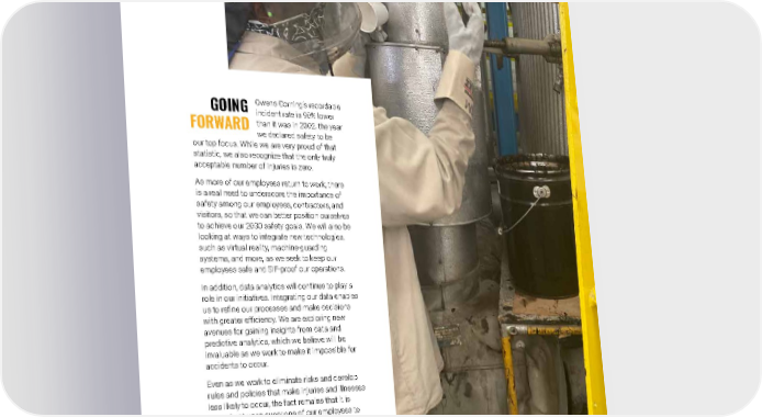 2021 Owens Corning Sustainability Report | Expanding Our Social Handprint | Living Safely | 262 Owens Corning’s recordable incident rate is 90% lower than it was in 2002, the year we declared safety to be our top focus. While we are very proud of that statistic, we also recognize that the only truly acceptable number of injuries is zero. As more of our employees return to work, there is a real need to underscore the importance of safety among our employees, contractors, and visitors, so that we can better position ourselves to achieve our 2030 safety goals. We will also be looking at ways to integrate new technologies, such as virtual reality, machine-guarding systems, and more, as we seek to keep our employees safe and SIF-proof our operations. In addition, data analytics will continue to play a role in our initiatives. Integrating our data enables us to refine our processes and make decisions with greater efficiency. We are exploring new avenues for gaining insights from data and predictive analytics, which we believe will be invaluable as we work to make it impossible for accidents to occur. Even as we work to eliminate risks and develop rules and policies that make injuries and illnesses less likely to occur, the fact remains that it is incumbent upon every one of our employees to remain diligent throughout the workday. We are proud of the dedication our people have shown thus far, and we encourage them to remain steadfast on our collective March to Zero. GOING FORWARD Photo submitted by: Claudia Cantu | Houston, Texas, U.S. Jevon Shepherd collects a sample to take to the QC lab at the Houston Roofing plant.