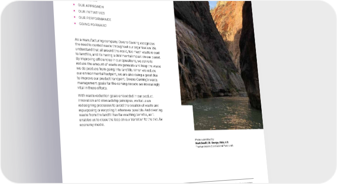 2021 Owens Corning Sustainability Report | Reducing Our Environmental Footprint | Waste Management | 178 WASTE MANAGEMENT In this chapter: ƒ 2030 GOALS ƒ OUR APPROACH ƒ OUR INITIATIVES ƒ OUR PERFORMANCE ƒ GOING FORWARD As a manufacturing company, Owens Corning recognizes the need to control waste throughout our organization. We understand that all around the world, too much waste is sent to landfills, and it’s having a detrimental impact on our planet. By improving efficiencies in our operations, we strive to reduce the amount of waste we generate and keep the waste we do produce from going into landfills. When we reduce our environmental footprint, we are also doing a great deal to improve our product handprint. Owens Corning’s waste management goals for the coming decade are increasingly vital in these efforts. With waste-reduction goals embedded in our product innovation and stewardship principles, we focus on redesigning processes to avoid the creation of waste and repurposing or recycling it whenever possible. And diverting waste from the landfill has far-reaching benefits, as it enables us to close the loop on our transition to the circular economy model. Our waste management efforts align with the following UN SDG: Photo submitted by: Mark Sendi | St. George, Utah, U.S. The Narrows in Zion National Park, Utah. Sustainability Materiality Definition: Our ambition is to mitigate the waste that we produce by redesigning the process to avoid its creation, and repurposing it whenever possible. We are committed to redefining waste, continuously looking for beneficial uses for our byproducts and other waste materials. The waste data in this chapter were independently assured to a moderate level by SCS Global Services. For more information on the assurance process see About the Report, and for our verification statement please see Appendix F . For the data in this section, baseline adjustments were made following the World Resources Institute (WRI) protocols. Read more on page 291 in About the Report.