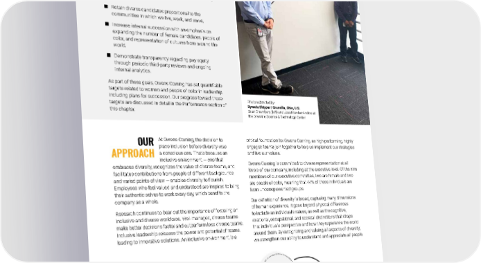2021 Owens Corning Sustainability Report | Expanding Our Social Handprint | Inclusion & Diversity | 217 OUR APPROACH At Owens Corning, the decision to place inclusion before diversity was a conscious one. That’s because an inclusive environment — one that embraces diversity, recognizes the value of diverse teams, and facilitates contributions from people of different backgrounds and varied points of view — enables diversity to flourish. Employees who feel valued and understood are inspired to bring their authentic selves to work every day, which benefits the company as a whole. Research continues to bear out the importance of fostering an inclusive and diverse workforce. Well-managed, diverse teams make better decisions faster and outperform less diverse teams. Inclusive leadership releases the power and potential of teams, leading to innovative solutions. An inclusive environment is a critical foundation for Owens Corning, as high-performing, highly engaged teams join together to help us implement our strategies and live our values. Owens Corning is committed to diverse representation at all levels of our company, including at the executive level. Of the nine members of our executive committee, two are female and two are people of color, meaning that 44% of these individuals are from underrepresented groups. Our definition of diversity is broad, capturing many dimensions of human experience. It goes beyond physical differences to include an individual’s values, as well as the cognitive, relational, occupational, and societal distinctions that shape that individual’s perspective and how they experience the world around them. By recognizing and valuing all aspects of diversity, we strengthen our ability to understand and appreciate all people. Photo submitted by: Syreeta Skipper | Granville, Ohio, U.S. Brian Chambers (left) and José Méndez-Andino at the Granville Science & Technology Center. By 2030, we aspire to: ■ Build and support diverse workforce and leadership teams that reflect the communities in which we live, work, and serve. ■ Retain diverse candidates proportional to the communities in which we live, work, and serve. ■ Increase internal succession with an emphasis on expanding the number of female candidates, people of color, and representation of cultures from around the world. ■ Demonstrate transparency regarding pay equity through periodic third-party reviews and ongoing internal analytics. As part of these goals, Owens Corning has set quantifiable targets related to women and people of color in leadership, including plans for succession. Our progress toward those targets are discussed in detail in the Performance section of this chapter. 2030 GOALS FOR INCLUSION & DIVERSITY