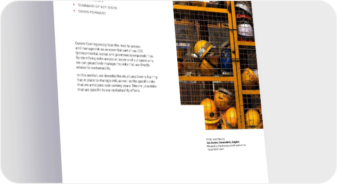 2021 Owens Corning Sustainability Report | Our Approach | Risk Management | 57 RISK MANAGEMENT In this chapter: ƒ OUR APPROACH ƒ SUMMARY OF KEY RISKS ƒ GOING FORWARD Owens Corning recognizes the need to assess and manage risk as an essential part of our ESG (environmental, social, and governance) responsibilities. By identifying risks across all aspects of our operations, we can proactively manage the risks that are directly related to sustainability. In this section, we describe the structures Owens Corning has in place to manage risk, as well as the specific risks that we anticipate over coming years. This includes risks that are specific to our sustainability efforts. Photo submitted by: Ron Barten | Tessenderlo, Belgium Personal protective equipment used at the Tessenderlo plant.