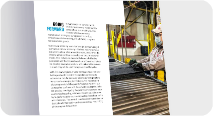 2021 Owens Corning Sustainability Report | Expanding Our Product Handprint | Circular Economy | 94 In many ways, our commitment to the circular economy model is at the center of our sustainability journey. It’s connected to our waste management strategies, our approach to product innovation and stewardship, and ultimately our plans for sustainable growth. Our circular economy team has brought a streamlining of our various circular economy initiatives, helping us focus our actions at our sites around the world, and they will be integral as we continue to develop our circular economy model. This will require the establishment of effective processes and the cooperation of our entire value chain as we develop innovative products and cultivate the markets in which they will be used throughout their life cycles. With this team in place, Owens Corning is now in an even better position to invest in the capabilities needed to achieve our circular economy ambitions, from people to resources to emerging technologies. We have begun a pilot program to build capability for recycling within our Composites business with the aim of enabling circularity. We are also investigating the potential in processes such as chemical recycling, which could prove valuable as we try to perform tasks such as separating fibers from resins and chemicals. This level of investment demonstrates our dedication to this bold — and very necessary — rethinking of the way we do business. GOING FORWARD Photo submitted by: Claudia Cantu | Houston, Texas, U.S. Alyssa Macias inspects shingles on the manufacturing line.