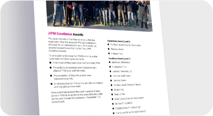 2021 Owens Corning Sustainability Report | Our Approach | Total Productive Maintenance | 81 JIPM Excellence Awards The Japan Institute of Plant Maintenance (JIPM), the organization that first proposed TPM and continues to advocate for its implementation around the world, has awarded several Owens Corning facilities JIPM Excellence Awards. To be eligible for the Award for TPM Excellence, a plant must meet the following requirements: ■ A minimum of three years of achievement using TPM. ■ The ability to demonstrate activity based on eight pillars of TPM by all staff members. ■ The completion of Step 4 for autonomous maintenance activity. ■ An infrastructure for TPM activity and obtained tangible and intangible achievements. Once a plant has received this Level 1 award and been active in TPM for an additional two years, they are eligible for the Level 2 Award for Excellence in Consistent TPM Commitment. Photo submitted by: Melissa Andrea Zabarain Garcia | Besana, Italy Employees at the Besana plant earned the JIPM excellence award. Consistency Award (Level 2) ■ Rio Claro, Brazil (Glass Reinforcements) ■ Tlaxcala, Mexico ■ Yuhang, China Excellence Award (Level 1) ■ Apeldoorn, Netherlands ■ Guangzhou, China ■ Jackson, Tennessee, U.S. ■ Kimchon, South Korea ■ L’Ardoise, France ■ Rio Claro, Brazil (Technical Fabrics) ■ Taloja, India ■ Tianjin, China ■ Besana, Italy (Glass Reinforcements)* ■ Suzhou, China (Alloy)* ■ Qingdao Novia, China (Roofing)* ■ Changzhou, China (Technical Fabrics)* * Awarded in 2021