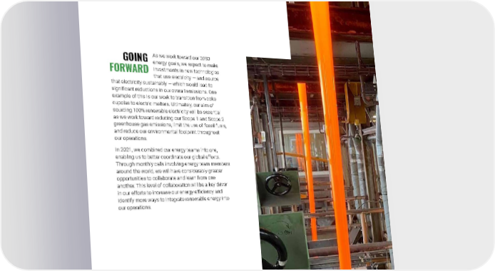 2021 Owens Corning Sustainability Report | Reducing Our Environmental Footprint | Energy Efficiency | 145 As we work toward our 2030 energy goals, we expect to make investments in new technologies that use electricity — and source that electricity sustainably — which would lead to significant reductions in our overall emissions. One example of this is our work to transition from coke cupolas to electric melters. Ultimately, our aim of sourcing 100% renewable electricity will be essential as we work toward reducing our Scope 1 and Scope 2 greenhouse gas emissions, limit the use of fossil fuels, and reduce our environmental footprint throughout our operations. In 2021, we combined our energy teams into one, enabling us to better coordinate our global efforts. Through monthly calls involving energy team members around the world, we will have considerably greater opportunities to collaborate and learn from one another. This level of collaboration will be a key driver in our efforts to increase our energy efficiency and identify more ways to integrate renewable energy into our operations. GOING FORWARD Photo submitted by: Anne Berthereau | Chambéry, France The FOAMGLAS ® manufacturing process, Tessenderlo, Belgium.