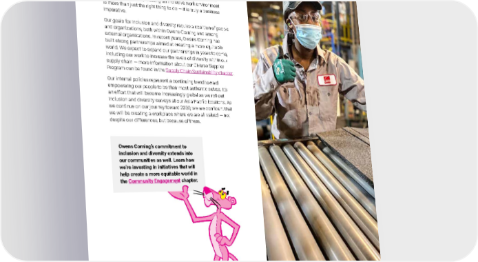 2021 Owens Corning Sustainability Report | Expanding Our Social Handprint | Inclusion & Diversity | 232 Owens Corning’s commitment to inclusion and diversity extends into our communities as well. Learn how we’re investing in initiatives that will help create a more equitable world in the Community Engagement chapter. GOING FORWARD There is a strong business case to be made for acting in ways that encourage inclusion and diversity, with a growing body of research indicating that diverse teams of people outperform homogeneous groups. By 2030, demographics in the U.S. and around the world will likely be very different than they are today. As our societies become increasingly diverse, creating an inclusive work environment is more than just the right thing to do — it is truly a business imperative. Our goals for inclusion and diversity require a coalition of people and organizations, both within Owens Corning and among external organizations. In recent years, Owens Corning has built strong partnerships aimed at creating a more equitable world. We expect to expand our partnerships in years to come, including our work to increase the levels of diversity within our supply chain — more information about our Diverse Supplier Program can be found in the Supply Chain Sustainability chapter . Our internal policies represent a continuing trend toward empowering our people to be their most authentic selves. It’s an effort that will become increasingly global as we roll out inclusion and diversity surveys at our Asia Pacific locations. As we continue on our journey toward 2030, we are confident that we will be creating a workplace where we are all valued — not despite our differences, but because of them. Photo submitted by: Claudia Cantu | Houston, Texas, U.S. Tonee Jones working the roofing line in Houston, Texas, U.S.