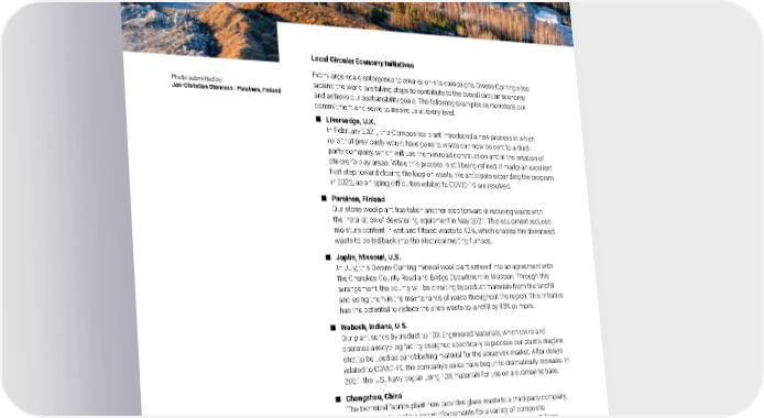 2021 Owens Corning Sustainability Report | Expanding Our Product Handprint | Circular Economy | 93 Local Circular Economy Initiatives From large-scale enterprises to smaller on-site campaigns, Owens Corning sites around the world are taking steps to contribute to the overall circular economy and achieve our sustainability goals. The following examples demonstrate our commitment and serve to inspire us at every level. ■ Liversedge, U.K. In February 2021, this Composites plant introduced a new process in which rolls that previously would have gone to waste can now be sent to a third- party company, which will use them in road construction and in the creation of children’s play areas. While this process is still being refined, it marks an excellent first step toward closing the loop on waste. We anticipate expanding the program in 2022, as shipping difficulties related to COVID-19 are resolved. ■ Parainen, Finland Our stone wool plant has taken another step forward in reducing waste with the installation of dewatering equipment in May 2021. This equipment reduced moisture content in wet and filtered waste to 12%, which enables the dewatered waste to be fed back into the electrical melting furnace. ■ Joplin, Missouri, U.S. In July, this Owens Corning mineral wool plant entered into an agreement with the Cherokee County Road and Bridge Department in Missouri. Through this arrangement, the county will be diverting byproduct materials from the landfill and using them in the maintenance of roads throughout the region. This initiative has the potential to reduce the site’s waste-to-landfill by 95% or more. ■ Wabash, Indiana, U.S. Our plant sends byproduct to 10X Engineered Materials, which owns and operates a recycling facility designed specifically to process our plant’s dragline shot to be used as sandblasting material for the abrasives market. After delays related to COVID-19, the company’s sales have begun to dramatically increase. In 2021, the U.S. Navy began using 10X materials for use on a submarine base. ■ Changzhou, China The technical fabrics plant here provides glass waste to a third-party company, which uses it to make glass reinforcements for a variety of composite applications. The company is also evaluating other Owens Corning Fabrics plants’ waste streams for use in their operations. ■ Fairburn, Georgia, U.S. This insulation facility uses over 100 million pounds of recycled glass each year. Among the sources for this glass is a third-party recycling company, which provides the plant with glass collected from apartment complexes, bars, restaurants, and stadiums throughout the Atlanta, Georgia, area. Photo submitted by: Jan-Christian Stenroos | Parainen, Finland