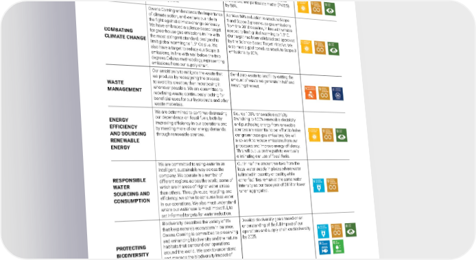 2021 Owens Corning Sustainability Report | Our Approach | UN SDG Alignment | 43 MATERIAL TOPIC EXPLANATION 2030 GOALS MOST RELEVANT SDGs AIR QUALITY MANAGEMENT As a manufacturer, we have the opportunity to improve our processes and, in doing so, reduce our impact on air quality in the areas where we operate. Reduce the aggregate intensity of our emissions of volatile organic compounds (VOCs) and fine particulate matter (PM2.5) by 50%. COMBATING CLIMATE CHANGE Owens Corning understands the importance of climate action, and we take our role in the fight against climate change seriously. We have embraced a science-based target for greenhouse gas emissions in line with the most stringent standard, designed to limit global warming to 1.5° Celsius. We also have a target to reduce our Scope 3 emissions, in line with well below the two degrees Celsius methodology, representing emissions from our supply chain. Achieve 50% reduction in absolute Scope 1 and Scope 2 greenhouse gas emissions from the 2018 baseline, in line with what is needed to limit global warming to 1.5° C. Our target has been validated and approved by the Science-Based Target Initiative. We also have a goal to reduce absolute Scope 3 emissions by 30%. WASTE MANAGEMENT Our ambition is to mitigate the waste that we produce by redesigning the process to avoid its creation, then repurposing it whenever possible. We are committed to redefining waste, continuously looking for beneficial uses for our byproducts and other waste materials. Send zero waste to landfill by cutting the amount of waste we generate in half and recycling the rest. ENERGY EFFICIENCY AND SOURCING RENEWABLE ENERGY We are determined to continue decreasing our dependence on fossil fuels, both by improving efficiency in our operations and by meeting more of our energy demands through renewable sources. Source 100% renewable electricity. Switching to 100% renewable electricity and purchasing energy from renewable sources are essential to our effort to halve our greenhouse gas emissions. We will also work to reduce emissions from our processes and improve energy efficiency. This will put us on the path to eventually eliminating our use of fossil fuels. RESPONSIBLE WATER SOURCING AND CONSUMPTION We are committed to using water in an intelligent, sustainable way across the company. We operate in a number of different regions across the world, some of which are in areas of higher water stress than others. Through reuse, recycling, and efficiency, we strive to consume less water in our operations. We also must understand where our water use is most impactful, to set informed targets for water reduction. Cut in half the amount we take from the local water supply in places where water is limited in quantity or quality, while other facilities remain at the same water intensity as our base year of 2018 or lower when aggregated. PROTECTING BIODIVERSITY Biodiversity describes the variety of life that keep nature’s ecosystem in balance. Owens Corning is committed to preserving and enhancing biodiversity and the natural habitats that surround our operations around the world. We seek to understand and manage the biodiversity impact of all our own operations, as well as gain insights into the impacts of our supply chain on biodiversity. Develop biodiversity goals based on an understanding of the full impact of our operations and supply chain on biodiversity by 2025. REDUCING OUR ENVIRONMENTAL FOOTPRINT Guiding Aspiration: Cut the negative impact of our operations in half.