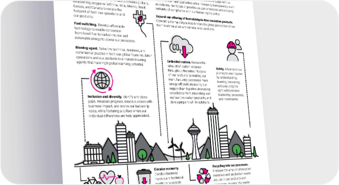 2021 Owens Corning Sustainability Report | Overview | Our Sustainability Aspirations | 15 Top Areas of Focus The work we’re doing toward our 2030 sustainability goals is described in more detail in the chapters of this report. There are several key areas of work that will support the goals. In some cases, multiple goals will be affected by one focus area. Accountability for progress on these critical priorities rests with our top business executives, ensuring broad engagement across the company in our sustainability work. These 11 areas represent a wide range of projects, initiatives, and opportunities for Owens Corning — our progress toward these priorities is chronicled in this report. Blowing agent. Solve the technical, business, and commercial puzzles in both our global foam insulation operations and our products to eliminate blowing agents that have high global warming potential. Renewable energy sourcing. Further reduce demand through energy efficiency and concurrently expand our renewable energy investments and purchases globally, establishing programs in China, India, Mexico, Brazil, Europe, and Canada to reduce the footprint of both our operations and our products. Fuel switching. Develop affordable technology to enable conversion from fossil fuel to carbon-neutral and renewable energy to power our processes. Expand our offering of formaldehyde-free insulation products . Convert to formaldehyde-free binders for global production of our technical insulation and mineral wool products. Embodied carbon. Reduce the amount of carbon released throughout the entire life cycle of our products by making our manufacturing processes more energy-efficient, improving our supply chain logistics, increasing recycled content, innovating low/ no/positive carbon products, and developing end-of-life solutions. Recycling into our processes. Increase the amount of recycled materials and production waste we use in our products and processes, tapping into waste- streams throughout our entire value chain, while eliminating waste-to-landfill. Safety. Advance in our journey to zero injuries by understanding, learning, innovating, and executing the right safety-related leadership, processes, and investments. Circular economy. Develop business models and technical solutions to recycle Owens Corning ® roofing, composites, and insulation products to advance the circular economy, reduce waste-to-landfill, and enable us to take back scrap material from our customers’ processes. Healthy living innovation. Develop strategies and tactics to inspire and engage all U.S. employees who are not yet enrolled in our wellness initiatives, and expand the participation of our employees outside the U.S. Inclusion and diversity. Identify and close gaps, measure progress, enable success with business impact, and evolve our leadership voice, while fostering a culture where our individual differences are truly appreciated. Supplier sustainability. Inspire our suppliers to engage with us around sustainability priorities while increasing transparency, such as reducing our Scope 3 greenhouse gas emissions and ensuring certainty of compliance with our human rights policy.