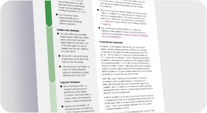 2021 Owens Corning Sustainability Report | Reducing Our Environmental Footprint | Energy Efficiency | 139 Our Energy Roadmap Owens Corning’s plan to increase energy efficiency and source renewable electricity includes the following strategies: Short-term Strategies ■ Increase renewable electricity consumption across the grid through additional wind Virtual Power Purchase Agreements (VPPAs) in Sweden and Finland. ■ Continue reducing the energy intensity of our operations through energy efficiency projects. Medium-term Strategies ■ Consider additional renewable energy opportunities on a global basis, including longer-term agreements, and consider PPAs in the other regions where we operate, such as Latin America and Asia Pacific. ■ Drive continued electrification of processes where feasible to reduce fossil fuel usage. ■ Through projects and sourcing, switch to 100% renewable electricity and improve energy efficiency by 20% by 2030. Long-term Strategies ■ Drive innovation within our research and development portfolio to enable further conversion from fossil fuels to carbon neutral and renewable energy to power our processes. ■ Explore new renewable fuel technologies and opportunities, working towards an aspiration of using 100% renewable energy. Outreach and Accountability Owens Corning ensures accountability and encourages further progress toward our sustainability goals. ■ We believe that rewarding our employees for their dedication to sustainability is essential, and we recognize teams that help us meet our energy goals with companywide performance awards. In addition, sustainability goals are a factor in incentive compensation for our management team. For example, we incentivize our composites energy teams with cash rewards and recognition. ■ Owens Corning partners with over 250 like-minded organizations in the U.S. Department of Energy’s Better Plants Program, which provides our energy leaders with tools, training and technical assistance. In addition, we have expanded our commitment to this program by entering the Better Plants Challenge described on page 141. ■ We use a number of external platforms, including our website and this sustainability report, to publicly disclose our environmental performance. We invite comments and feedback from all our stakeholders. Power Purchase Agreements To expand our renewable energy platform, we have entered long-term power purchase agreements (PPAs), which support the development of large renewable energy projects. The PPAs signed in 2015 enabled wind capacity in Texas and Oklahoma, with the potential to generate 1.1 million megawatt hours (MWh) of electricity each year, from a capacity of 250 megawatts (MW) of renewable electricity. This includes 125 MW of wind energy in Texas and another 125 MW in Oklahoma. Owens Corning aspires to have contracts in place covering 75% of our global enterprise electricity demand through renewable agreements which will drive additionality to the grid over the next two years. Within the United States today, for every MWh of electricity generated by the renewable installation, we receive one energy attribute certificate (EAC), which we then apply to the manufacturing of our products. We retire all the EACs generated from our PPAs, which reduce our environmental footprint and the embodied carbon of our products. While it’s possible for a company to reduce its footprint simply by purchasing EACs, Owens Corning believes that we should also be directly responsible for bringing more renewable electricity into the grid through power purchase agreements or virtual power purchase agreements (VPPAs). The (VPPAs) that Owens Corning entered in 2021 will add 91 MW of renewable capacity to the grid. We have entered into two wind VPPAs, one in Finland and one in Sweden, which will bring in 43 MW and 48 MW of renewable electricity capacity, respectively. The VPPA in Sweden reached its commercial date of operation in 2021, while the VPPAs in Finland will reach its commercial date of operation in 2022.