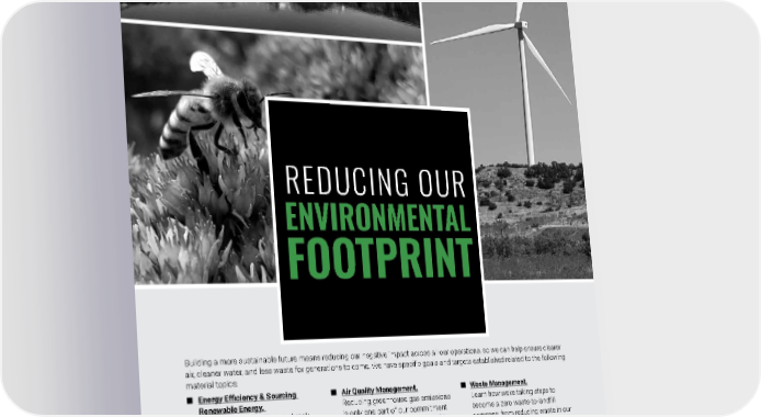 Building a more sustainable future means reducing our negative impact across all our operations, so we can help ensure clearer air, cleaner water, and less waste for generations to come. We have specific goals and targets established related to the following material topics: ■ Energy Efficiency & Sourcing Renewable Energy. Discover how our efforts to break away from fossil fuels — and use less energy in general — are central to achieving our sustainability goals. ■ Combating Climate Change. Owens Corning recognizes climate change’s devastating effects on the planet. Learn how we’re reducing the greenhouse gas emissions that cause climate change. ■ Air Quality Management. Reducing greenhouse gas emissions is only one part of our commitment to cleaner air. See how we’re working to improve air quality in other ways, too. ■ Responsible Water Sourcing & Consumption. Owens Corning relies on high-quality water in our processes — from the same sources that other people depend on. Discover how we’re working to protect this increasingly precious resource. ■ Waste Management. Learn how we’re taking steps to become a zero waste-to-landfill company, from reducing waste in our processes to increasing our recycling. ■ Protecting Biodiversity. The world lives in a delicate balance, with each species playing a role in our survival. Learn more about the steps were taking to protect species around our sites. REDUCING OUR ENVIRONMENTAL FOOTPRINT