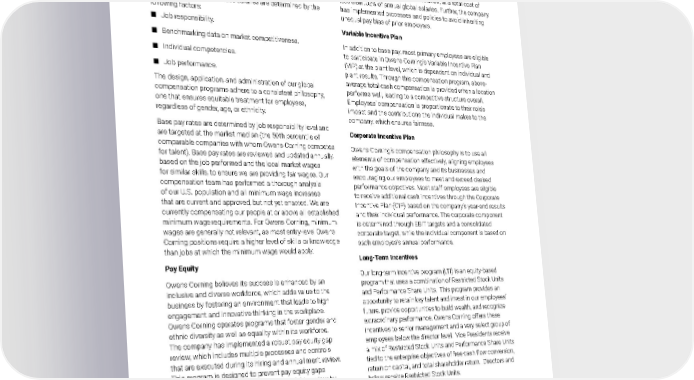 2021 Owens Corning Sustainability Report | Expanding Our Social Handprint | Employee Experience | 211 SUMMARY OF COMPENSATION AND BENEFITS Owens Corning believes that employees should be compensated in ways that are performance-driven, market- competitive, and equitable. Through base and variable pay, we seek to reward both individual and collective contributions to our business’s success. Base salaries are determined by the following factors: ■ Job responsibility. ■ Benchmarking data on market competitiveness. ■ Individual competencies. ■ Job performance. The design, application, and administration of our global compensation programs adhere to a consistent philosophy, one that ensures equitable treatment for employees, regardless of gender, age, or ethnicity. Base pay rates are determined by job responsibility level and are targeted at the market median (the 50th percentile of comparable companies with whom Owens Corning competes for talent). Base pay rates are reviewed and updated annually, based on the job performed and the local market wages for similar skills, to ensure we are providing fair wages. Our compensation team has performed a thorough analysis of our U.S. population and all minimum wage increases that are current and approved, but not yet enacted. We are currently compensating our people at or above all established minimum wage requirements. For Owens Corning, minimum wages are generally not relevant, as most entry-level Owens Corning positions require a higher level of skills or knowledge than jobs at which the minimum wage would apply. Pay Equity Owens Corning believes its success is enhanced by an inclusive and diverse workforce, which adds value to the business by fostering an environment that leads to high engagement and innovative thinking in the workplace. Owens Corning operates programs that foster gender and ethnic diversity as well as equality within its workforce. The company has implemented a robust pay equity gap review, which includes multiple processes and controls that are executed during its hiring and annual merit review. This program is designed to prevent pay equity gaps from occurring. We ensure the success of this review by performing a biennial pay equity review with the assistance of a third-party vendor. The third-party review includes a robust, statistical analysis of pay equity across its global salaried workforce. Consistent with its commitment to “equal pay for equal work,” the company remediates all identified and substantiated pay gaps through pay increases. The review in 2021 demonstrated that less than 1.4% of its 5,700 global salaried employees required remediation, at a total cost of less than .02% of annual global salaries. Further, the company has implemented processes and policies to avoid inheriting unequal pay bias of prior employers. Variable Incentive Plan In addition to base pay, most primary employees are eligible to participate in Owens Corning’s Variable Incentive Plan (VIP) at the plant level, which is dependent on individual and plant results. Through this compensation program, above- average total cash compensation is provided when a location performs well, leading to a competitive structure overall. Employees’ compensation is proportionate to their role’s impact and the contributions the individual makes to the company, which ensures fairness. Corporate Incentive Plan Owens Corning’s compensation philosophy is to use all elements of compensation effectively, aligning employees with the goals of the company and its businesses and encouraging our employees to meet and exceed desired performance objectives. Most staff employees are eligible to receive additional cash incentives through the Corporate Incentive Plan (CIP) based on the company’s year-end results and their individual performance. The corporate component is determined through EBIT targets and a consolidated corporate target, while the individual component is based on each employee’s annual performance. Long-Term Incentives Our long-term incentive program (LTI) is an equity-based program that uses a combination of Restricted Stock Units and Performance Share Units. This program provides an opportunity to retain key talent and invest in our employees’ future, provide opportunities to build wealth, and recognize extraordinary performance. Owens Corning offers these incentives to senior management and a very select group of employees below the director level. Vice Presidents receive a mix of Restricted Stock Units and Performance Share Units tied to the enterprise objectives of free cash flow conversion, return on capital, and total shareholder return. Directors and below receive Restricted Stock Units.