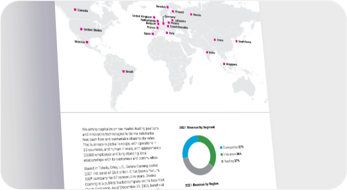 2021 Owens Corning Sustainability Report | Overview | About Owens Corning | 8 2021 Revenue by Segment 2021 Revenue by Region Composites 27% Insulation 36% Roofing 37% United States 67% Europe 16% Asia Pacific 9% Canada and Other 8% We aim to capitalize on our market-leading positions and innovative technologies to deliver substantial free cash flow and sustainable shareholder value. The business is global in scope, with operations in 33 countries, and human in scale, with approximately 20,000 employees and long-standing, local relationships with its customers and communities. Based in Toledo, Ohio, U.S., Owens Corning posted 2021 net sales of $8.5 billion. It has been a Fortune 500 ® company for 67 consecutive years. Owens Corning is a publicly traded company on the New York Stock Exchange. As of December 31, 2021, beneficial ownership includes: Blackrock, Inc. (11.5%) and The Vanguard Group (9.73%). Read more about our businesses in the Owens Corning Annual Report on Form 10-K, available at http://investor.owenscorning.com . Owens Corning has manufacturing and research and development facilities around the world. Our world headquarters are located at One Owens Corning Parkway, Toledo, Ohio, 43659, U.S. Chin a In dia Sing ap ore So uth Ko rea Czech Re public Finland France It aly Li thua nia Be lgi um Po land Ru ssia Sp ain Swe den Un ited Kingdom Brazil Ca nada Mexico Un ited States Ne therla nds Germ an y