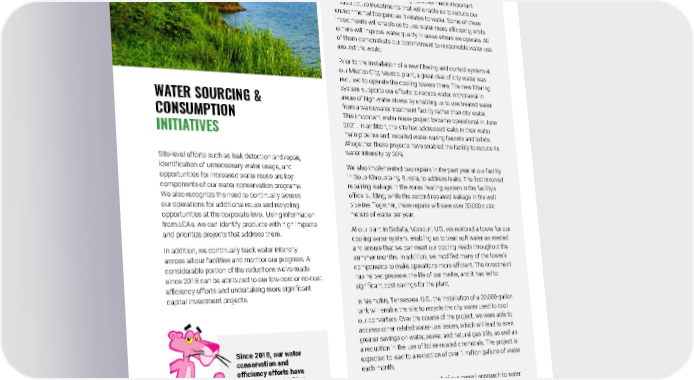 2021 Owens Corning Sustainability Report | Reducing Our Environmental Footprint | Responsible Water | 174 WATER SOURCING & CONSUMPTION INITIATIVES Site-level efforts such as leak detection and repair, identification of unnecessary water usage, and opportunities for increased water reuse are key components of our water conservation programs. We also recognize the need to continually assess our operations for additional reuse and recycling opportunities at the corporate level. Using information from LCAs, we can identify products with high impacts and prioritize projects that address them. In addition, we continually track water intensity across all our facilities and monitor our progress. A considerable portion of the reductions we’ve made since 2018 can be attributed to our low-cost or no-cost efficiency efforts and undertaking more significant capital investment projects. INVESTMENTS IN INFRASTRUCTURE ADVANCE OUR WATER GOALS In 2021, several Owens Corning facilities made important infrastructure investments that will enable us to reduce our environmental footprint as it relates to water. Some of these investments will enable us to use water more efficiently, while others will improve water quality in areas where we operate. All of them demonstrate our commitment to responsible water use around the world. Prior to the installation of a new filtering and control system at our Mexico City, Mexico, plant, a great deal of city water was required to operate the cooling towers there. The new filtering system supports our efforts to reduce water withdrawal in areas of high water stress by enabling us to use treated water from a wastewater treatment facility rather than city water. This important water reuse project became operational in June 2021. In addition, the site has addressed leaks in their water main pipeline and installed water-saving faucets and toilets. Altogether, these projects have enabled the facility to reduce its water intensity by 20%. We also implemented two repairs in the past year at our facility in Gous-Khroustalny, Russia, to address leaks. The first involved repairing leakage in the water heating system in the facility’s office building, while the second repaired leakage in the well pipeline. Together, these repairs will save over 30,000 cubic meters of water per year. At our plant in Sedalia, Missouri, U.S., we restored a tower for our cooling water system, enabling us to treat soft water as needed and ensure that we can meet our cooling needs throughout the summer months. In addition, we modified many of the tower’s components to make operations more efficient. The investment has helped preserve the life of our melter, and it has led to significant cost savings for the plant. In Memphis, Tennessee, U.S., the installation of a 20,000-gallon tank will enable the site to recycle the city water used to cool our converters. Over the course of the project, we were able to address other related water-use issues, which will lead to even greater savings on water, sewer, and natural gas bills, as well as a reduction in the use of boiler-related chemicals. The project is expected to lead to a reduction of over 1 million gallons of water each month. Projects such as these are part of our overall approach to water use. Many of these investments will lead to a reduced reliance on municipal water systems, which helps ensure that we are doing our part to use water responsibly in the communities where we operate. As we look ahead, we anticipate more opportunities to invest in our infrastructure in ways that make a real difference in reducing our environmental footprint. Since 2018, our water conservation and efficiency efforts have saved enough drinking water for about 1.1 million people for a year. Photo submitted by: Priyanka Ruparel | Maharahstra, India