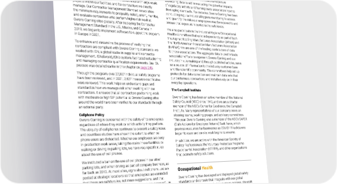 2021 Owens Corning Sustainability Report | Expanding Our Social Handprint | Living Safely | 260 Contractor Management Since contractors who work with Owens Corning are held to the same standards as the company’s employees, they must attend and provide appropriate safety training for their employees. We conduct behavior-based observations, walkthrough inspections, and audits to ensure that contractors maintain the health and safety of our workplace. We also have consistent processes for prequalifying and measuring contractor performance associated with large-scale projects within our facilities, and for contractors we directly manage. Our Contractor Management Standard establishes the minimum requirements to prequalify, select, orient, monitor, and evaluate contractors who perform higher risk work at Owens Corning sites globally. After deploying the Contractor Management Standard in the U.S., Mexico, and Canada in 2019, we began to implement software to support the program in Europe in 2021. To enhance and streamline the process of verifying that contractors are compliant with Owens Corning standards, we worked with ISN, a global leader in supplier and contractor management. ISNetworld, ISN’s system, facilitated establishing and managing contractor qualification requirements. Our ISN process was detailed earlier in this chapter on page 248. Through the program, over 27,037 individual safety programs have been reviewed, and in 2021, 2,827 insurance certificates were reviewed. This work helps us understand gaps and standardize how we manage risk when working with our contractors. It ensures that all contractors performing work with moderate or high SIF potential at Owens Corning sites around the world have been verified to our standards through an external party. Cellphone Policy Owens Corning is concerned with the safety of its employees, regardless of where they work or which activity they perform. The ubiquity of cell phones continues to present a safety issue, and countless studies have shown the extent to which cell phone users are distracted. Whether our employees are busy in production work areas, taking the stairs in our facilities, or walking or driving in parking lots, we have very specific rules about the use of cell phones. We instituted a ban on the use of cell phones in our sites’ parking lots, and when driving as part of company business, as far back as 2012. At most sites, signs about cell phone use are posted at strategic locations so that employees are reminded that these are safety rules, not mere suggestions, and that every individual is responsible for ensuring we are successful in our efforts toward zero injuries. Partnerships in Safety Owens Corning is fully engaged with our industry partners to help influence safety and regulatory standards, which has a global impact and reinforces our position as a leader in safety. Through our active involvement and leadership in trade associations’ industrial hygiene or safety committees, we provide our industry with occupational-exposure monitoring data to aid in evaluating the potential impacts of regulatory activity and framing trade association input to developing standards. For decades, Owens Corning has been conducting regular industrial hygiene monitoring to assess and quantify the risks our employees may be exposed to and ensure that exposure is controlled to safe levels. We also participate in the Industrial Hygiene/Occupational Health committees that exist independently as part of both the Asphalt Roofing Manufacturers Association (ARMA) and the North American Insulation Manufacturers Association (NAIMA). We are one of the leading contributors of data to those associations. The aggregate data is used in trade association efforts to represent Owens Corning and our industry in rule-making and, through published articles, serve as a source of information to the industry customer base and the scientific community. The committees help set up protocols for data collection and maintain data sets that our customers, contractors, and installers rely on in their everyday operations. The Campbell Institute Owens Corning has been an active member of the National Safety Council (NSC) since 1943, and we are a charter member of the NSC’s Center for Excellence, the Campbell Institute. Many representatives of our company serve on steering teams, working groups, and advisory committees. This year, Owens Corning was a member of the NSC’s SAFER (Safe Actions for Employee Returns) Task Force, which provides resources for businesses as COVID-19 lockdowns began to ease and on-site work begins to resume. In addition, we are active with the American Society of Safety Professionals, the Voluntary Protection Programs Participants’ Association (VPPPA), and other organizations that promote safety solutions. Occupational Health Owens Corning has developed and deployed global safety standards and controls that integrate with our global occupational health and industrial hygiene process. We work to understand, control, and eliminate — whenever possible — the potential for exposure to work-related hazards that pose a risk to employee health. Exposure potentials are assessed and evaluated against established exposure limits to ensure risk is quantified and understood. This understanding drives efforts in mitigating, reducing, and eliminating these risks. Where exposure