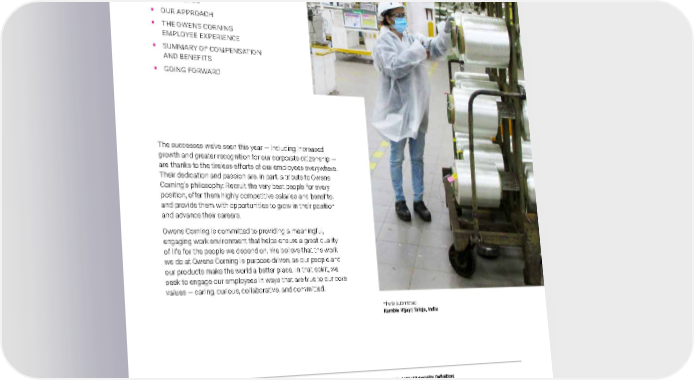 2021 Owens Corning Sustainability Report | Expanding Our Social Handprint | Employee Experience | 201 EMPLOYEE EXPERIENCE In this chapter: ƒ 2030 GOALS ƒ OUR APPROACH ƒ THE OWENS CORNING EMPLOYEE EXPERIENCE ƒ SUMMARY OF COMPENSATION AND BENEFITS ƒ GOING FORWARD The successes we’ve seen this year — including increased growth and greater recognition for our corporate citizenship — are thanks to the tireless efforts of our employees everywhere. Their dedication and passion are, in part, a tribute to Owens Corning’s philosophy: Recruit the very best people for every position, offer them highly competitive salaries and benefits, and provide them with opportunities to grow in their position and advance their careers. Owens Corning is committed to providing a meaningful, engaging work environment that helps ensure a great quality of life for the people we depend on. We believe that the work we do at Owens Corning is purpose-driven, as our people and our products make the world a better place. In that spirit, we seek to engage our employees in ways that are true to our core values — caring, curious, collaborative, and committed. Our employee experience efforts align with the following UN SDGs: Sustainability Materiality Definition: We believe our employees should grow as people and as professionals while working at Owens Corning. We seek to attract the best people and provide every employee with the opportunity to develop and reach their full potential, in a work environment full of both challenge and optimism. The social data in this chapter marked with a + sign were independently assured to a moderate level by SCS Global Services. The social data in this chapter marked with a ^ sign were independently assured to a high level by SCS Global Services. For more information on the assurance process see About the Report , and for our verification statement please see Appendix F . Photo submitted: Kamble Vijay | Taloja, India