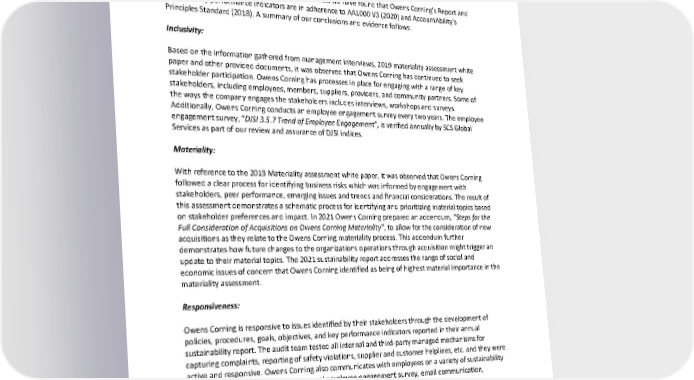 © SCS Global Services Page 3 of 5 § Owens Corning’s Report was found to conform with the Consolidated Set of GRI Sustainability Reporting Standards (2020) . Adherence to the AA1000 Principles Based on the methodology and activities performed we have found that Owens Corning’s Report and specified key performance indicators are in adherence to AA1000 V3 (2020) and AccountAbility’s Principles Standard (2018). A summary of our conclusions and evidence follows: Inclusivity: Based on the information gathered from management interviews, 2019 materiality assessment white paper and other provided documents, it was observed that Owens Corning has continued to seek stakeholder parti cipation. Owens Corning has processes in place for engaging with a range of key stakeholders, including employees, members, suppliers, providers, and community partners. Some of the ways the company engages the stakeholders includes interviews, workshops and surveys . Additionally, Owens Corning conducts an employee engagement survey every two years. The employee engagement survey, “ DJSI 3.5.7 Trend of Employee Engagement” , is verified annually by SCS Global Services as part of our review and assurance of DJ SI indices. Materiality: With reference to the 2019 Materiality assessment white paper, it was observed that Owens Corning followed a clear process for identifying business risks which was informed by engagement with stakeholders, peer performance, eme rging issues and trends and financial considerations. The result of this assessment demonstrates a schematic process for identifying and prioritizing material topics based on stakeholder preferences and impact . In 2021 Owens Corning prepared an addendum, “Steps for the Full Consideration of Acquisitions on Owens Corning Materiality ” , to allow for the consideration of new acquisitions as they relate to the Owens Corning materiality process . Th is addendum further demonstrates how future changes to the organizations operations through acquisition might trigger an update to their material topics. The 2021 sustainability report addresses the range of social and economic issues of concern that Owens Corning identified as being of highest material importance in the materiality assessment. Responsiveness: Owens Corning is respo nsive to issues identified by their stakeholders through the development of policies, procedures, goals, objectives, and key performance indica tors reported in their annual sustainability report . The audit team tested all internal and third -party managed mechanisms for capturing complaints, reporting of safety violations, supplier and customer helplines, etc. and they were active and responsive. Owens Corning also communicates with employees on a variety of sustainability issues through team meetings, an annual employee engagement survey, email communication, noticeboards, and the corporate intranet. 2021 Owens Corning Sustainability Report | Appendices | 347 ASSURANCE STATEMENT Appendix F