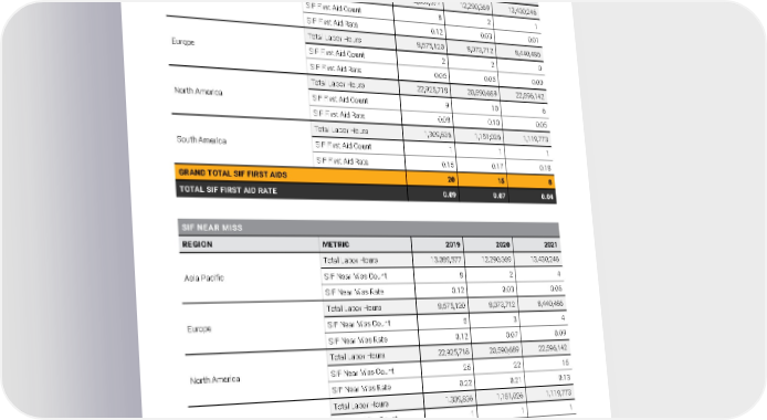 WORKFORCE DATA SAFETY DATA Appendix B 2021 Owens Corning Sustainability Report | Appendices | 304 2021 Serious Injuries and Fatalities (SIF) + SIF FIRST AIDS REGION METRIC 2019 2020 2021 Asia Pacific Total Labor Hours 13,089,577 12,290,369 13,430,246 SIF First Aid Count 8 2 1 SIF First Aid Rate 0.12 0.03 0.01 Europe Total Labor Hours 8,575,120 8,073,712 8,440,486 SIF First Aid Count 2 2 0 SIF First Aid Rate 0.05 0.05 0.00 North America Total Labor Hours 22,925,718 20,590,689 22,596,142 SIF First Aid Count 9 10 6 SIF First Aid Rate 0.08 0.10 0.05 South America Total Labor Hours 1,309,836 1,151,026 1,119,773 SIF First Aid Count 1 1 1 SIF First Aid Rate 0.15 0.17 0.18 GRAND TOTAL SIF FIRST AIDS 20 15 8 TOTAL SIF FIRST AID RATE 0.09 0.07 0.04 SIF NEAR MISS REGION METRIC 2019 2020 2021 Asia Pacific Total Labor Hours 13,089,577 12,290,369 13,430,246 SIF Near Miss Count 8 2 4 SIF Near Miss Rate 0.12 0.03 0.06 Europe Total Labor Hours 8,575,120 8,073,712 8,440,486 SIF Near Miss Count 5 3 4 SIF Near Miss Rate 0.12 0.07 0.09 North America Total Labor Hours 22,925,718 20,590,689 22,596,142 SIF Near Miss Count 25 22 15 SIF Near Miss Rate 0.22 0.21 0.13 South America Total Labor Hours 1,309,836 1,151,026 1,119,773 SIF Near Miss Count 1 1 1 SIF Near Miss Rate 0.15 0.17 0.18 GRAND TOTAL SIF NEAR MISSES 39 28 24 TOTAL SIF NEAR MISS RATE 0.17 0.13 0.11