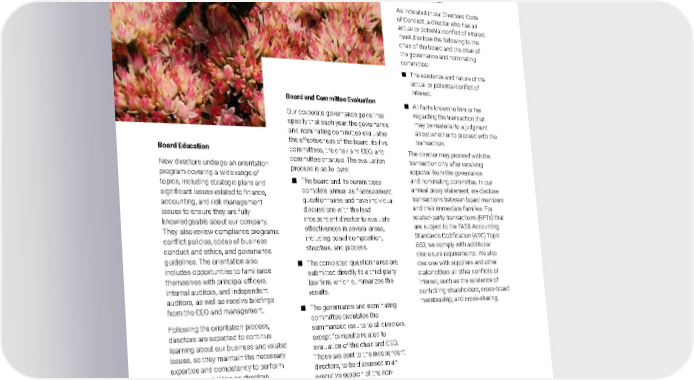 2021 Owens Corning Sustainability Report | Our Approach | Board Leadership | 54 Photo submitted by: Danyelle Lynne Phelps | Granville, Ohio, U.S. The carpenter bee, a valuable pollinator in the ecosystem. Board Education New directors undergo an orientation program covering a wide range of topics, including strategic plans and significant issues related to finance, accounting, and risk management issues to ensure they are fully knowledgeable about our company. They also review compliance programs, conflict policies, codes of business conduct and ethics, and governance guidelines. The orientation also includes opportunities to familiarize themselves with principal officers, internal auditors, and independent auditors, as well as receive briefings from the CEO and management. Following the orientation process, directors are expected to continue learning about our business and related issues, so they maintain the necessary expertise and competency to perform their responsibilities as directors. This continued learning includes consultations with our executive officers, reviewing relevant materials, visiting offices and plants, and participating in third-party educational programs. The governance and nominating committee also receives periodic updates on environmental, social, and governance issues. Board and Committee Evaluation Our corporate governance guidelines specify that each year, the governance and nominating committee evaluates the effectiveness of the board, its five committees, the chair and CEO, and committee charters. The evaluation process is as follows: ■ The board and its committees complete annual self-assessment questionnaires and have individual discussions with the lead independent director to evaluate effectiveness in several areas, including board composition, structure, and process. ■ The completed questionnaires are submitted directly to a third-party law firm, which summarizes the results. ■ The governance and nominating committee circulates the summarized results to all directors, except for results related to evaluation of the chair and CEO. Those are sent to the independent directors, to be discussed in an executive session of the non- management directors. Conflicts of Interest We have written policies and procedures in place related to avoiding, managing, and disclosing conflicts of interest by directors, officers, employees, and members of their immediate families. As indicated in our Directors’ Code of Conduct, a director who has an actual or potential conflict of interest must disclose the following to the chair of the board and the chair of the governance and nominating committee: ■ The existence and nature of the actual or potential conflict of interest. ■ All facts known to him or her regarding the transaction that may be material to a judgment about whether to proceed with the transaction. The director may proceed with the transaction only after receiving approval from the governance and nominating committee. In our annual proxy statement, we disclose transactions between board members and their immediate families. For related-party transactions (RPTs) that are subject to the FASB Accounting Standards Codification (ASC) Topic 850, we comply with additional disclosure requirements. We also disclose with suppliers and other stakeholders all other conflicts of interest, such as the existence of controlling shareholders, cross-board membership, and cross-sharing.