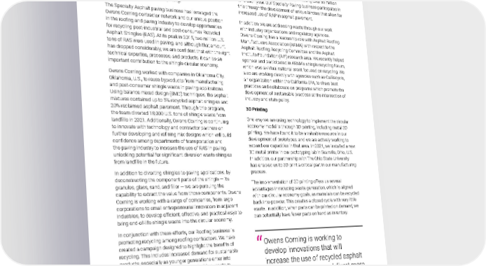2021 Owens Corning Sustainability Report | Expanding Our Product Handprint | Circular Economy | 89 Shingle Recycling Each year, over 13 million U.S. tons of shingle waste is generated. Less than 10% of that is manufacturing waste, and the remaining balance consists of shingles removed at the end of their life, after decades of use protecting homes. Over the years, Owens Corning has attempted to solve this problem with varied approaches. By volume, the most impactful use of shingle waste has historically been to process for reuse into asphalt paving. The Specialty Asphalt paving business has leveraged the Owens Corning contractor network and our unique position in the roofing and paving industry to develop opportunities for recycling post-industrial and post-consumer Recycled Asphalt Shingles (RAS). At its peak in 2015, two million U.S. tons of RAS were used in paving, and although that amount has dropped considerably, we are confident that with the right technical expertise, processes, and products, it can be an important contribution to the shingle circular economy. Owens Corning worked with companies in Oklahoma City, Oklahoma, U.S., to reuse byproducts from manufacturing and post-consumer shingle waste in paving applications. Using balance mixed design (BMD) techniques, the asphalt mixtures contained up to 5% recycled asphalt shingles and 20% reclaimed asphalt pavement. Through this program, the team diverted 18,000 U.S. tons of shingle waste from landfills in 2021. Additionally, Owens Corning is continuing to innovate with technology and contractor partners on further developing and refining mix designs which will build confidence among departments of transportation and the paving industry to increase the use of RAS in paving, unlocking potential for significant diversion waste shingles from landfills in the future. In addition to diverting shingles to paving applications, by deconstructing the component parts of the shingle — its granules, glass, sand, and filler — we are pursuing the capability to extract the value from those components. Owens Corning is working with a range of companies, from large corporations to small entrepreneurial innovators in adjacent industries, to develop efficient, effective, and practical ways to bring end-of-life shingle waste into the circular economy. In conjunction with these efforts, our Roofing business is promoting recycling among roofing contractors. We have created a campaign designed to highlight the benefits of recycling. This includes increased demand for sustainable products, especially as younger generations enter into homeownership, as well as limits on building waste in landfills, which are imminent. To support contractors in this campaign, we have developed a range of marketing materials, including flyers, yard signs, door hangers, and more, which they can use to differentiate themselves from the competition and to help build their brand as a company that cares about sustainability. While our ability to fully implement this campaign remains contingent on the availability of shingle recycling sites near the contractor, we are confident that this engagement of contractors can be an important component of our shingle recycling initiatives in the future. We are also working with the markets into which these products would go, from roofing solutions to industrial asphalt and the specialty paving industry. The use of reclaimed asphalt pavements (RAP) is one of the largest circular economies in the U.S., representing over 85 million tons each year. Our Specialty Paving business participates in this through the development of unique binders that allow for increased use of RAP in asphalt pavement. In addition, we are addressing waste through our work with industry organizations and regulatory agencies. Owens Corning has a leadership role with Asphalt Roofing Manufacturers Association (ARMA) with respect to the Asphalt Roofing Recycling Committee and the Asphalt Institute Foundation (AIF) research area. We recently helped sponsor and participated in ARMA’s shingle recycling forum, which was a virtual national event focused on recycling. We also are working directly with agencies such as CalRecycle, an organization within the California EPA, to share best practices and collaborate on programs which promote the development of sustainable practices at the intersection of industry and state policy. 3D Printing One way we are using technology to implement the circular economy model is through 3D printing, including metal 3D printing. We have found it to be a valuable resource in our development of prototypes, and we are actively working to expand our capacities in that area. In 2021, we installed a new 3D metal printer in our prototyping lab in Granville, Ohio, U.S. In addition, our partnership with The Ohio State University has enabled us to 3D print a critical part in our manufacturing process. The implementation of 3D printing offers us several advantages in reducing waste generation, which is aligned with our circular economy goals, as materials can be recycled back into powder. This creates a closed cycle with very little waste. In addition, when parts can be printed on demand, we can potentially have fewer parts on hand as inventory. Owens Corning is working to develop innovations that will increase the use of recycled asphalt shingles in paving — and divert more shingle waste from landfills. ” “