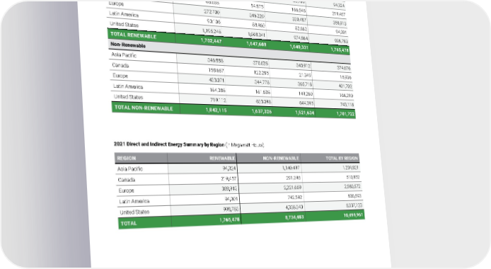 ENVIRONMENTAL DATA ENERGY DATA Appendix C 2021 Owens Corning Sustainability Report | Appendices | 309 Renewable and Non-Renewable Electricity Consumption by Region (in Megawatt Hours) 2018 2019 2020 2021 Renewable Asia Pacific 77,835 89,291 85,769 94,324 Canada 66,558 54,875 166,548 219,457 Europe 272,700 346,220 330,487 358,913 Latin America 90,106 88,960 82,663 94,001 United States 1,195,248 1,068,341 974,864 998,783 TOTAL RENEWABLE 1,702,447 1,647,688 1,640,331 1,765,478 Non-Renewable Asia Pacific 346,888 375,528 340,912 374,676 Canada 158,657 122,285 21,349 15,936 Europe 433,071 344,778 365,718 401,702 Latin America 184,388 161,638 149,260 166,290 United States 719,112 633,098 644,395 743,118 TOTAL NON-RENEWABLE 1,842,115 1,637,326 1,521,634 1,701,722 REGION RENEWABLE NON-RENEWABLE TOTAL BY REGION Asia Pacific 94,324 1,140,497 1,234,821 Canada 219,457 291,395 510,852 Europe 358,913 2,221,659 2,580,572 Latin America 94,001 742,592 836,593 United States 998,783 4,338,340 5,337,123 TOTAL 1,765,478 8,734,483 10,499,961 2021 Direct and Indirect Energy Summary by Region (in Megawatt Hours)