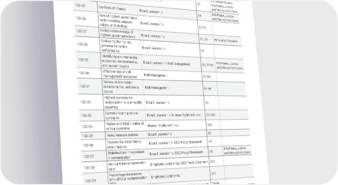 2021 Owens Corning Sustainability Report | Appendices | 366 GRI INDEX Appendix J DISCLOSURE NUMBER DESCRIPTION 2021 TEXT LOCATION PA G E NUMBER SDG TARGET LINKAGE 102-23 Chair of the highest governance body Board Leadership 52 #16 Peace, Justice and Strong Institutions 102-24 Nominating and selecting the highest governance body Board Leadership 52 #5 Gender Equality #16 Peace, Justice and Strong Institutions 102-25 Conflicts of interest Board Leadership 54 #16 Peace, Justice and Strong Institutions 102-26 Role of highest governance body in setting purpose, values, and strategy Board Leadership 51-53 102-27 Collective knowledge of highest governance body Board Leadership 51, 53 #4 Quality Education 102-28 Evaluating the highest governance body’s performance Board Leadership 53 102-29 Identifying and managing economic, environmental, and social impacts Board Leadership; Risk Management 52, 57-64 #16 Peace, Justice and Strong Institutions 102-30 Effectiveness of risk management processes Risk Management 57-64 102-31 Review of economic, environmental, and social topics Risk Management 61-64 102-32 Highest governance body’s role in sustainability reporting Board Leadership 53 102-33 Communicating critical concerns Board Leadership; Human Rights & Ethics 55, 282 102-34 Nature and total number of critical concerns Human Rights & Ethics 282 102-35 Remuneration policies Board Leadership 55 102-36 Process for determining remuneration Board Leadership; 2022 Proxy Statement 55 102-37 Stakeholders’ involvement in remuneration Board Leadership; 2022 Proxy Statement 55 #16 Peace, Justice and Strong Institutions 102-38 Annual total compensation ratio Employee Experience; 2022 Proxy Statement 211 102-39 Percentage increase in annual total compensation ratio Employee Experience 211 102-40 List of stakeholder groups Stakeholder Management & Material Issues 34-40 102-41 Collective bargaining agreements Employee Experience; Living Safely; Human Rights & Ethics 213, 249, 277 #8 Decent Work and Economic Growth 102-42 Identifying and selecting stakeholders Stakeholder Management & Material Issues 34-40