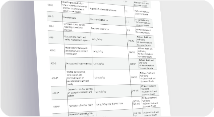 2021 Owens Corning Sustainability Report | Appendices | 373 GRI INDEX Appendix J DISCLOSURE NUMBER DESCRIPTION 2019 TEXT LOCATION PA G E NUMBER SDG TARGET LINKAGE 401-1 New employee hires and employee turnover Appendix B - Workforce Data 297 #5 Gender Equality #8 Decent Work and Economic Growth 401-2 Benefits provided to full- time employees that are not provided to temporary or part-time employees Appendix D - General Disclosures 327 #8 Decent Work and Economic Growth 401-3 Parental leave Employee Experience 213 #5 Gender Equality #8 Decent Work and Economic Growth 402-1 Minimum notice periods regarding operational changes Employee Experience 213 #8 Decent Work and Economic Growth 403-1 Occupational health and safety management system Living Safely 246-262 #3 Good Health and Well-being #8 Decent Work and Economic Growth 403-2 Hazard identification, risk assessment, and incident investigation Living Safely 246-262 #3 Good Health and Well-being #8 Decent Work and Economic Growth 403-3 Occupational health services Living Safely 260-261 #3 Good Health and Well-being #8 Decent Work and Economic Growth 403-4* Worker participation, consultation, and communication on occupational health and safety Living Safely 246-262 #3 Good Health and Well-being #8 Decent Work and Economic Growth 403-5* Description: Worker training on occupational health and safety Living Safely 246-262 #3 Good Health and Well-being #8 Decent Work and Economic Growth 403-6* Promotion of worker health Living Safely; Health & Wellness 260-261, 263-272 #3 Good Health and Well-being #8 Decent Work and Economic Growth 403-7 Prevention and mitigation of occupational health and safety impacts directly linked by business relationships Living Safely 249, 259- 261 #8 Decent Work and Economic Growth 403-8* Workers covered by an occupational health and safety management system Living Safely 246-262 #8 Decent Work and Economic Growth 403-9 Work-related injuries Living Safely; Appendix B - Workforce Data 261, 298- 305 #8 Decent Work and Economic Growth Economic