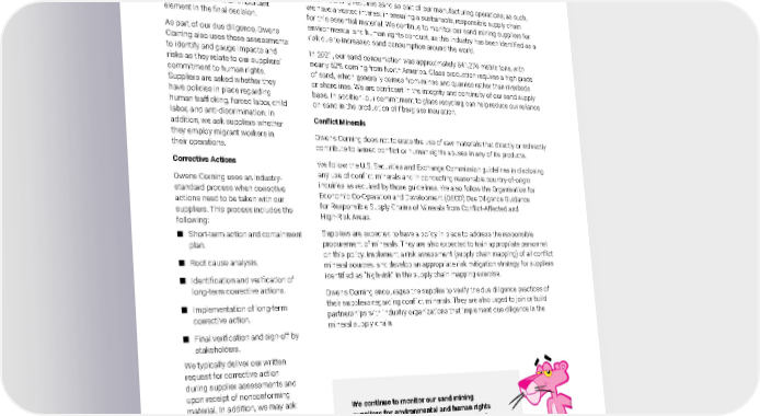 2021 Owens Corning Sustainability Report | Expanding Our Product Handprint | Supply Chain Sustainability | 131 of their own code of conduct. 98% of respondent suppliers say they meet the standards set by our Supplier Code of Conduct. + When training buyers or professionals responsible for making decisions regarding the selection of suppliers or the awarding of business, the information gained from the sustainability survey is always stressed as an important element in the final decision. As part of our due diligence, Owens Corning also uses these assessments to identify and gauge impacts and risks as they relate to our suppliers’ commitment to human rights. Suppliers are asked whether they have policies in place regarding human trafficking, forced labor, child labor, and anti-discrimination. In addition, we ask suppliers whether they employ migrant workers in their operations. Corrective Actions Owens Corning uses an industry- standard process when corrective actions need to be taken with our suppliers. This process includes the following: ■ Short-term action and containment plan. ■ Root cause analysis. ■ Identification and verification of long-term corrective actions. ■ Implementation of long-term corrective action. ■ Final verification and sign-off by stakeholders. We typically deliver our written request for corrective action during supplier assessments and upon receipt of nonconforming material. In addition, we may ask suppliers to provide additional inspection data with a shipment, showing actual measurements for critical characteristics, as well as signoffs from management at supplier locations. Areas of Human Rights Concern As part of our overall commitment to supply chain sustainability, Owens Corning is taking steps to manage known risks that may exist among our suppliers. Our goal is to mitigate these risks wherever possible through proactive measures and consistent monitoring. Sand Mining Owens Corning requires sand as part of our manufacturing operations; as such, we have a vested interest in ensuring a sustainable, responsible supply chain for this essential material. We continue to monitor our sand mining suppliers for environmental and human rights conduct, as this industry has been identified as a risk due to increased sand consumption around the world. In 2021, our sand consumption was approximately 841,276 metric tons, with nearly 62% coming from North America. Glass production requires a high grade of sand, which generally comes from mines and quarries rather than riverbeds or shorelines. We are confident in the integrity and continuity of our sand supply base. In addition, our commitment to glass recycling can help reduce our reliance on sand in the production of fiberglass insulation. Conflict Minerals Owens Corning does not tolerate the use of raw materials that directly or indirectly contribute to armed conflict or human rights abuses in any of its products. We follow the U.S. Securities and Exchange Commission guidelines in disclosing any use of conflict minerals and in conducting reasonable country-of-origin inquiries as required by those guidelines. We also follow the Organisation for Economic Co-Operation and Development (OECD) Due Diligence Guidance for Responsible Supply Chains of Minerals from Conflict-Affected and High-Risk Areas. Suppliers are expected to have a policy in place to address the responsible procurement of minerals. They are also expected to train appropriate personnel on this policy, implement a risk assessment (supply chain mapping) of all conflict mineral sources, and develop an appropriate risk mitigation strategy for suppliers identified as “high-risk” in the supply chain mapping exercise. Owens Corning encourages the supplier to verify the due diligence practices of their suppliers regarding conflict minerals. They are also urged to join or build partnerships with industry organizations that implement due diligence in the mineral supply chain. We continue to monitor our sand mining suppliers for environmental and human rights conduct, as this industry has been identified as a risk due to increased sand consumption around the world.
