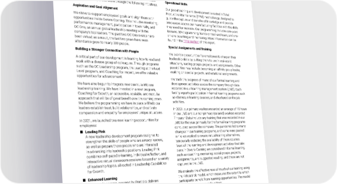 2021 Owens Corning Sustainability Report | Expanding Our Social Handprint | Employee Experience | 206 Learning & Development Initiatives The investments we make in every employee benefit both the individual and the company. Our learning and development opportunities extend throughout our employees’ time at Owens Corning, from early career development and midcareer advancement to executive-level cohort learning. We seek to deliver these experiences by aligning them with our business strategy, and we pursue them through the following initiatives. Aspiration and Goal Alignment We strive to support employees’ goals and align them with opportunities inside Owens Corning. This includes mentoring, performance management, participation in town halls, and OC One, an annual global leadership meeting with the company’s top leaders. The past two OC One events have been virtual; as a result, the last two years have seen attendance grow to nearly 300 people. Building a Stronger Connection with People A critical part of our development is learning how to lead and work with a diverse group of colleagues. Through programs such as the OC Leadership program, the Leading at the Next Level program, and Coaching for Impact, we offer valuable opportunities for advancement. We have also begun to integrate new curricula into our leadership training. We have invested in a new program, Coaching for Growth, an accessible, scalable, and modular approach that will be of great benefit over the coming years. We believe the programming we have in place will help our leaders establish trust, build relationships, and cultivate compassion and empathy for employees’ unique situations. In 2021, we launched two new learning opportunities for employees: ■ Leading Pink A new leadership development program designed to strengthen the skills of people who are already leaders, as well as prepare those people who are interested in advancing into leadership positions. Leading Pink combines self-paced e-learning, individual reflection, and interactive virtual classroom sessions focused on a variety of leadership topics, all rooted in Leadership Capabilities for Growth. ■ Enhanced Learning Enhanced Learning, powered by Percipio, delivers new learning resources to support our global staff employees’ unique development goals. Percipio, as it is commonly referred to, offers personal and professional development tools, skills training, continuing education, and professional certification preparation. These learning modules cover a broad range of topics, from leadership skills to learning technical or data analysis skills. Strategy and Commercial Skills In addition to providing our employees with tangible skills, we also endeavor to advance their ability to think critically and strategically. Employees hone these skills through workshops and projects focused on customer-inspired growth, product management, human-centered design, organizational design, and strategy execution. Operational Skills Our global training and development is rooted in Total Productive Maintenance (TPM) methodology, designed to guide the capture and transfer of knowledge and provide employees across our manufacturing facilities with the skills they need for success. Our programming includes one-point lessons, 3D diagramming, hands-on test-and-learn, and one- on-one coaching and mentoring. More information can be found in the TPM section of this report. Special Assignments and Training We provide opportunities for employees to sharpen their leadership skills by putting them to use in real-world situations, leading groups, projects, and assignments. Other possibilities may include becoming an affinity group leader, working on special projects, and rotational assignments. We track the progress of many of our formal learning and development activities across the company through data recorded in our learning management system (LMS). Each facility reports participation in formal learning programs such as classes, e-learning courses, and structured on-the-job activities. In 2021, our primary workers recorded an average of 18 hours in our LMS and our non-primary (salaried) workers recorded 7 hours. + Data include any training that was recorded in our LMS for the year, primarily for the formal learning programs conducted across the company. The pandemic led to many changes in our training programs, and some were paused while we worked to create virtual training alternatives, temporarily reducing the availability of these courses. Most of the learning and development activities that take place in Owens Corning are considered informal learning, such as coaching, mentoring, social groups, projects, assignments, and suggested reading, and these are not captured in the LMS. We evaluate the effectiveness of much of our training using the Kirkpatrick model, which measures the extent to which participants benefit from learning opportunities. The model gauges effectiveness on four tiers: ■ Reaction. Did the participants enjoy the training? ■ Learning. Did the participants gain new knowledge? ■ Behavior. Will the participants apply the learning to their everyday experience? ■ Results. What impact has the training had on performance metrics?