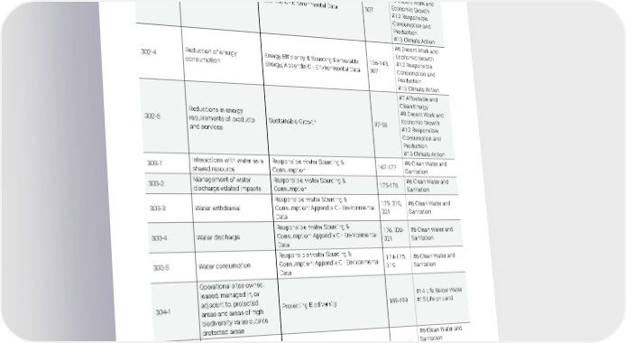2021 Owens Corning Sustainability Report | Appendices | 370 GRI INDEX Appendix J DISCLOSURE NUMBER DESCRIPTION 2021 TEXT LOCATION PA G E NUMBER SDG TARGET LINKAGE 302-3 Energy intensity Appendix C - Environmental Data 307 #7 Affordable and Clean Energy #8 Decent Work and Economic Growth #12 Responsible Consumption and Production #13 Climate Action 302-4 Reduction of energy consumption Energy Efficiency & Sourcing Renewable Energy; Appendix C - Environmental Data 138-143, 307 #8 Decent Work and Economic Growth #12 Responsible Consumption and Production #13 Climate Action 302-5 Reductions in energy requirements of products and services Sustainable Growth 97-98 #7 Affordable and Clean Energy #8 Decent Work and Economic Growth #12 Responsible Consumption and Production #13 Climate Action 303-1 Interactions with water as a shared resource Responsible Water Sourcing & Consumption 167-177 #6 Clean Water and Sanitation 303-2 Management of water discharge-related impacts Responsible Water Sourcing & Consumption 175-176 #6 Clean Water and Sanitation 303-3 Water withdrawal Responsible Water Sourcing & Consumption; Appendix C - Environmental Data 175, 319, 321 #6 Clean Water and Sanitation 303-4 Water discharge Responsible Water Sourcing & Consumption; Appendix C - Environmental Data 176, 320- 321 #6 Clean Water and Sanitation 303-5 Water consumption Responsible Water Sourcing & Consumption; Appendix C - Environmental Data 174-175, 319 #6 Clean Water and Sanitation 304-1 Operational sites owned, leased, managed in, or adjacent to, protected areas and areas of high biodiversity value outside protected areas Protecting Biodiversity 189-199 #14 Life Below Water #15 Life on Land 304-2 Significant impacts of activities, products, and services on biodiversity Protecting Biodiversity 189-199 #6 Clean Water and Sanitation #14 Life Below Water #15 Life on Land 304-3 Habitats protected or restored Protecting Biodiversity 189-199 #6 Clean Water and Sanitation #14 Life Below Water #15 Life on Land