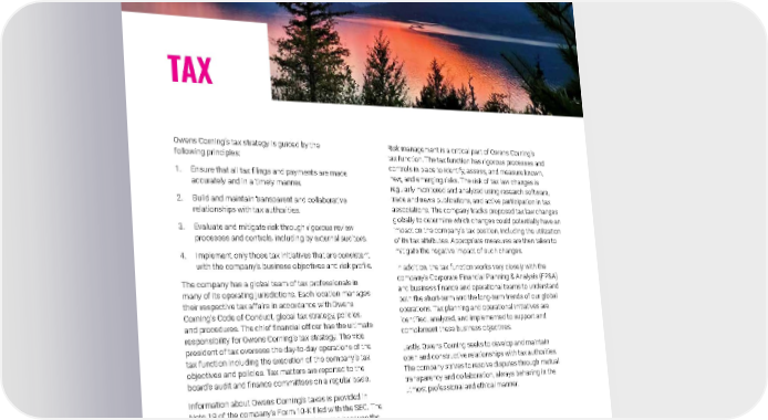 2021 Owens Corning Sustainability Report | Our Approach | Ta x | 83 TAX Owens Corning’s tax strategy is guided by the following principles: 1. Ensure that all tax filings and payments are made accurately and in a timely manner. 2. Build and maintain transparent and collaborative relationships with tax authorities. 3. Evaluate and mitigate risk through rigorous review processes and controls, including by external auditors. 4. Implement only those tax initiatives that are consistent with the company’s business objectives and risk profile. The company has a global team of tax professionals in many of its operating jurisdictions. Each location manages their respective tax affairs in accordance with Owens Corning’s Code of Conduct, global tax strategy, policies, and procedures. The chief financial officer has the ultimate responsibility for Owens Corning’s tax strategy. The vice president of tax oversees the day-to-day operations of the tax function including the execution of the company’s tax objectives and policies. Tax matters are reported to the board’s audit and finance committees on a regular basis. Information about Owens Corning’s taxes is provided in Note 19 of the company’s Form 10-K filed with the SEC. The information is bifurcated into U.S. and Foreign because the U.S. provides the majority of the company’s earnings before interest and taxes (EBIT). The management discussion and analysis (MD&A) section of Form 10-K provides an explanation of why the company’s global effective tax rate differs from the U.S. statutory rate. An additional table is provided in Note 19 Income Taxes to further explain the material differences between the effective tax rate and the statutory tax rate. Risk management is a critical part of Owens Corning’s tax function. The tax function has rigorous processes and controls in place to identify, assess, and measure known, new, and emerging risks. The risk of tax law changes is regularly monitored and analyzed using research software, trade and news publications, and active participation in tax associations. The company tracks proposed tax law changes globally to determine which changes could potentially have an impact on the company’s tax position, including the utilization of its tax attributes. Appropriate measures are then taken to mitigate the negative impact of such changes. In addition, the tax function works very closely with the company’s Corporate Financial Planning & Analysis (FP&A) and business finance and operational teams to understand both the short-term and the long-term trends of our global operations. Tax planning and operational initiatives are identified, analyzed, and implemented to support and complement these business objectives. Lastly, Owens Corning seeks to develop and maintain open and constructive relationships with tax authorities. The company strives to resolve disputes through mutual transparency and collaboration, always behaving in the utmost professional and ethical manner. Photo submitted by: Leila Pourzahedi | Granville, Ohio, U.S. Whistler, British Columbia