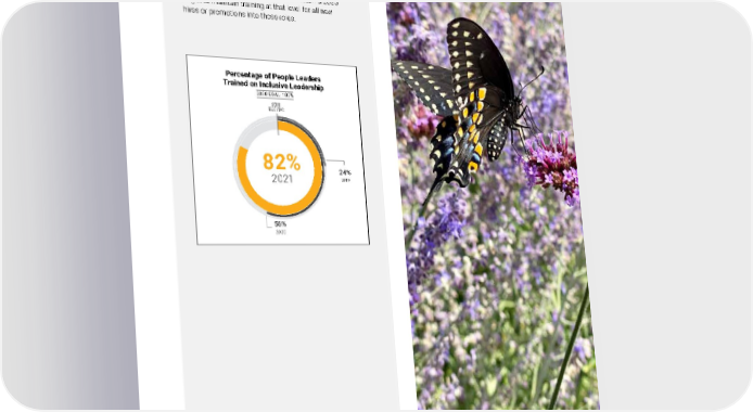 2021 Owens Corning Sustainability Report | Overview | Summary & Highlights | 30 Photo submitted by: Kelly Picking | Toledo, Ohio, U.S. Inclusive Leadership Training We had set a target for 100% of our people leaders, from first level leaders through mid-level leaders, directors, and vice presidents to attend our internal inclusive leadership training by the end of 2021. While we fell short of that goal, we maintain a 2030 target to maintain training at that level for all new hires or promotions into those roles. Percentage of People Leaders Trained on Inclusive Leadership 2030 GOAL: 100% 82% 2021 2018 BASE YEAR 24% 2019 56% 2020