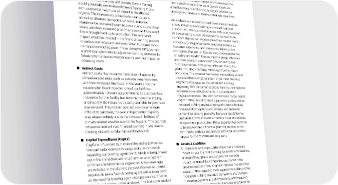 2021 Owens Corning Sustainability Report | Appendices | 356 TCFD CLIMATE RISK & OPPORTUNITIES Appendix G ■ Direct Costs Owens Corning incorporates the impact of the identified risks into its direct operating costs for financial planning models based on a number of factors including the likelihood, timeframe, and magnitude of the financial impact of the risk or opportunity. For example, in the event of reduced production capacity due to climate-related increases in storm activity and severity, Owens Corning would potentially see increased (Direct) Operating Costs with substantial magnitude of impact in the affected regions. The increase would be due to cleanup costs, as well as alternate transportation costs, increased maintenance, increased sourcing costs due to supply chain strain, and likely increased production costs as the repaired line is brought back up to production. This estimated impact would be included in the financial planning process in various scenarios and analyses. When Hurricane Sandy damaged our roofing plant in New Jersey in 2012, we had a good example to use to adjust our planning estimates for future potential severe weather events and their impact on operating costs. ■ Indirect Costs Indirect costs like insurance have been influenced by climate-related risks, such as extreme weather events and their increased likelihood. In the years since the catastrophic flood impacted one of our facilities approximately 10 years ago, continuing to purchase flood insurance for this facility has become more challenging, and recently the insurance capacity available for purchase was reduced. This indirect cost not only became more difficult to purchase, the available protection capacity was altered entirely due to the increased likelihood of climate-related weather events like flooding. This example influences indirect cost financial planning in any Owens Corning site with similar natural disaster risk. ■ Capital Expenditures (CapEx) CapEx is influenced by climate risks and opportunities. One particular example is a regulatory transition risk regarding our blowing agent blend, which is being phased out in the immediate and short term as a component of climate/environmental regulation. A few years ago, we included in the planning process the new equipment required to use a foam blowing agent with a lower GWP, as the need for blowing agent changes was identified in our risk and opportunities analyses. The first such product with a lower GWP blowing agent, FOAMULAR ® NGX™, was announced in mid-2020 to coincide with regulations in Canada and in certain U.S. States in effect as of January 2021. Our response to identified climate related risks and opportunities like these has had a substantial impact on our financial planning of capital allocation. ■ Acquisitions & Divestments Identified climate risks and opportunities have had a moderate impact on our financial planning for acquisitions and divestments. Over the last several years acquisitions have been an important part of our growth strategy. We look for acquisition opportunities with businesses that meet specific criteria: They must provide stable and attractive margins and strong synergies, address our target growth areas, and meet our strategic objectives. We evaluate our acquisition candidates through multiple lenses, including sustainability, and we ask a critical question: Will this business be better with us as its owner? As sustainability guides our operations, we want to be confident that we can improve the environmental, health, and safety (EHS) performance, employee experience, customer experience, and community impact of the companies that join us. Can we bring a new perspective on safety and health? Can we improve energy efficiency and lower waste in operations? Owens Corning has purchased several companies in the last four to five years, including InterWrap, Pittsburgh Corning, Paroc, and vliepa. The acquired businesses successfully expand the capabilities and global reach of our three business segments (Composites, Insulation, and Roofing). Improving EHS performance and enhancing the employee experience are critical elements in our acquisition integration process. The identified climate change related opportunities, including more aggressive building codes, increased building materials demand due to potentially increased storm activity and severity, and improved demand for existing products due to our reputation for sustainable products were all factors in our acquisitions to expand our product line. These opportunities continue to be involved in our financial planning process as we continue to evaluate and analyze additional acquisition targets for the medium and long term. ■ Assets & Liabilities Climate risks and opportunities have had a moderate impact on our financial planning for assets and liabilities, primarily through our acquisitions. We consider the acquisition of the companies mentioned in the previous section in the long-term horizon. The identified opportunities regarding more aggressive building codes, increased building materials demand due to changes in weather patterns and storm activity, and improved demand for existing products due to our reputation for sustainable products were all factors in our acquisitions to expand our product line. These opportunities continue to be involved in our financial planning process as we continue to evaluate and analyze additional acquisition targets.