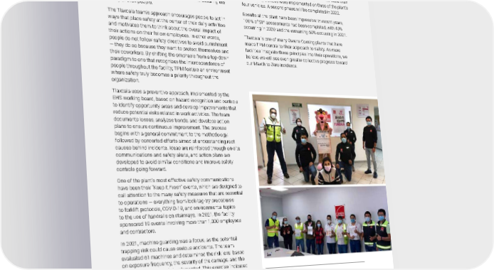 2021 Owens Corning Sustainability Report | Expanding Our Social Handprint | Living Safely | 250 When Total Productive Maintenance becomes an integral part of a plant’s philosophy toward safety, the results can be highly beneficial. That has been the case in Tlaxcala, Mexico, where the team has created a culture of engagement and participation in TPM that extends throughout all aspects of their operations, especially as they relate to ensuring the safety of their people. The Tlaxcala team’s approach encourages people to act in ways that place safety at the center of their daily activities and motivates them to think about the overall impact of their actions on their fellow employees. In other words, people do not follow safety directives to avoid punishment — they do so because they want to protect themselves and their coworkers. By shifting the emphasis from a top-down paradigm to one that recognizes the interdependence of people throughout the facility, TPM fosters an environment where safety truly becomes a priority throughout the organization. Tlaxcala uses a preventive approach, implemented by the EHS working board, based on hazard recognition and controls to identify opportunity areas and develop improvements that reduce potential risks related in work activities. The team documents losses, analyzes trends, and develops action plans to ensure continuous improvement. The process begins with a general commitment to the methodology, followed by concerted efforts aimed at understanding root causes behind incidents. Ideas are reinforced through on-site communications and safety alerts, and action plans are developed to avoid similar conditions and improve safety controls going forward. One of the plant’s most effective safety communications have been their “Keep It Fresh” events, which are designed to call attention to the many safety measures that are essential to operations — everything from lock-tag-try procedures to forklift protocols, COVID-19, and environmental topics to the use of handrails on stairways. In 2021, the facility sponsored 19 events involving more than 1,000 employees and contractors. In 2021, machine guarding was a focus, as the potential trapping risk could cause serious accidents. The team evaluated 61 machines and determined the risk level based on exposure frequency, the severity of the damage, and the current safety controls implemented. This exercise indicated 10 very high-risk machines, 27 high-risk machines, 20 medium risk machines and four with low risk. TPM LEADS TO SIF SUCCESSES IN TLAXCALA Photos submitted by: Isabel Fernandez | Tlaxcala, Mexico Members of the EHS team in Tlaxcala Aligned with the high-risk reduction plan and the SIF prevention approach, safety controls were improved on robotic vehicles that transfer product between forming and ovens — machines that are among the highest risk. More than 142 security devices were implemented on three of the plant’s four vehicles. A second phase will be completed in 2022. Results at the plant have been impressive: In recent years, 100% of SIF assessments had been completed, with 40% occurring in 2020 and the remaining 60% occurring in 2021. Tlaxcala is one of many Owens Corning plants that have made TPM central to their approach to safety. As more facilities integrate these principles into their operations, we believe we will see even greater collective progress toward our March to Zero incidents.