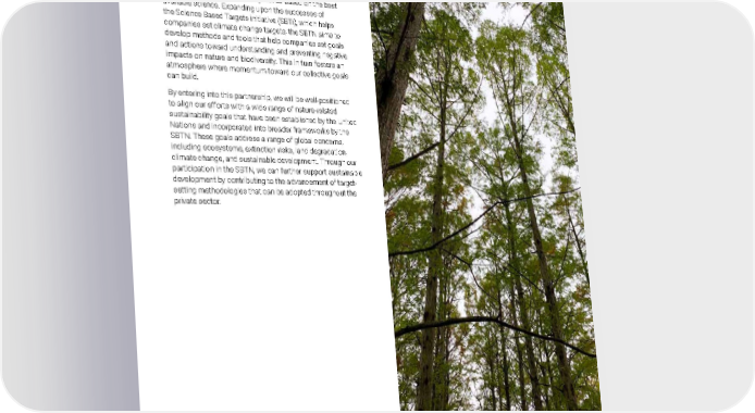 2021 Owens Corning Sustainability Report | Reducing Our Environmental Footprint | Protecting Biodiversity | 192 Science Based Targets Network In 2020, Owens Corning joined the Science Based Targets Network (SBTN), which is part of the Global Commons Alliance. The SBTN is a network of international environmental nonprofit organizations, agencies, and mission-driven entities. Their goal is to empower individuals, companies, and governments to become stewards of the environment using science-based targets — measurable, actionable, and time-bound objectives based on the best available science. Expanding upon the successes of the Science Based Targets initiative (SBTi), which helps companies set climate change targets, the SBTN aims to develop methods and tools that help companies set goals and actions toward understanding and preventing negative impacts on nature and biodiversity. This in turn fosters an atmosphere where momentum toward our collective goals can build. By entering into this partnership, we will be well-positioned to align our efforts with a wide range of nature-related sustainability goals that have been established by the United Nations and incorporated into broader frameworks by the SBTN. These goals address a range of global concerns, including ecosystems, extinction risks, land degradation, climate change, and sustainable development. Through our participation in the SBTN, we can further support sustainable development by contributing to the advancement of target- setting methodologies that can be adopted throughout the private sector. Photo submitted by: Cheryl Smith | Newark, Ohio, U.S. Dawes Arboretum, Newark, Ohio.