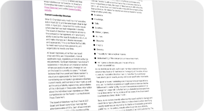 2021 Owens Corning Sustainability Report | Our Approach | Board Leadership | 52 The board has five committees: ■ Audit committee. ■ Compensation committee. ■ Executive committee. ■ Finance committee. ■ Governance and nominating committee. Information about these committees and their responsibilities can be found in the Board and Committee Membership section of our 2022 Proxy Statement and on the Owens Corning website. Current Leadership Structure Brian D. Chambers assumed the chief executive role in April 2019, and became board chair in April 2020. In April 2021, Suzanne P. Nimocks began a two-year term as lead independent director. The board of directors has complete access to the company’s management, with an ongoing ability to review the board’s leadership structure and make changes as it deems necessary and appropriate. This gives them the flexibility to meet varying business, personnel, and organizational needs over time. All board members, other than our board chair and CEO, are independent under all applicable legal, regulatory, and stock exchange requirements. Six board members have relevant experience in industrials and materials sectors where our products are sold. Average tenure on the board is currently six years. The board believes that the current and future leadership structure is appropriate for Owens Corning considering our company’s governance structure, current needs, and business environment, as well as the unique talents, experiences, and attributes of the individuals in these roles. More information about the individual board members and their competencies can be found in our most recent Proxy Statement. The board of directors met five times in 2021. Board and board committee meetings had attendance rates of 99%. Each of our directors attended at least 75% of the meetings of the board and the board committees on which he or she served. In 2021, the non-management directors met in executive session five times. Our lead independent director (LID) presides over all executive sessions of the board meetings attended by the LID. Nomination and Selection of Qualified Board Members The board of directors is responsible for nominating candidates to the board, who are then elected by stockholders. They also fill vacancies that may occur between annual meetings of stockholders. Owens Corning has formal procedures in place for the nomination and selection of potential board members. The governance and nominating committee is authorized to recommend only those candidates who meet our Director Qualification Standards. For a company director to be considered independent, the board of directors must affirm that the individual has no direct or indirect relationship with the company other than as director. Nominees for director are selected based on a wide range of criteria, including: ■ Experience. ■ Knowledge. ■ Skills. ■ Expertise. ■ Mature judgment. ■ Acumen. ■ Character. ■ Integrity. ■ Diversity. ■ The ability to make analytical inquiries. ■ Understanding of the company’s business environment. ■ Willingness to devote adequate time and effort to board responsibilities. As outlined in our bylaws, each board member is elected individually on an annual basis and must receive the majority of the votes. All our current non-executive directors have no more than four additional mandates to public boards, as required by our qualification standards. The governance and nominating committee examines principal skills to evaluate the director’s experience and qualifications to serve as director. With respect to sustainability, the committee assesses experience in or management responsibility for furthering sustainable business practices that address environmental, social, or ethical issues. Nine of our current board members demonstrate this skill. Because we believe diversity enhances the board’s ability to manage and direct the company, the committee considers diversity when identifying director nominees, as required by its charter and corporate governance guidelines. In this context, diversity refers to gender, race, ethnicity, nationality, national origin, or other elements of an individual’s identity. The effectiveness of this process is assessed annually by the full board as part of its self-evaluation process.