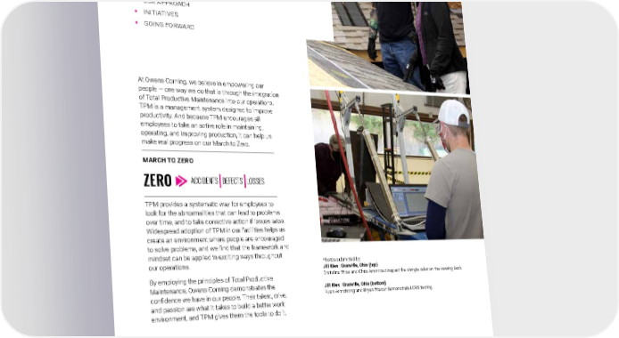 2021 Owens Corning Sustainability Report | Our Approach | Total Productive Maintenance | 78 TOTAL PRODUCTIVE MAINTENANCE In this chapter: ƒ OUR APPROACH ƒ INITIATIVES ƒ GOING FORWARD At Owens Corning, we believe in empowering our people — one way we do that is through the integration of Total Productive Maintenance into our operations. TPM is a management system designed to improve productivity. And because TPM encourages all employees to take an active role in maintaining, operating, and improving production, it can help us make real progress on our March to Zero. TPM provides a systematic way for employees to look for the abnormalities that can lead to problems over time, and to take corrective action if issues arise. Widespread adoption of TPM in our facilities helps us create an environment where people are encouraged to solve problems, and we find that the framework and mindset can be applied in exciting ways throughout our operations. By employing the principles of Total Productive Maintenance, Owens Corning demonstrates the confidence we have in our people. Their talent, drive, and passion are what it takes to build a better work environment, and TPM gives them the tools to do it. Photos submitted by: Jill Ries | Granville, Ohio (top) Christina Wise and Chris Amintrout inspect the shingle color on the viewing deck. Jill Ries | Granville, Ohio (bottom) Ryan Armstrong and Bryan Walser demonstrate LOBS testing. MARCH TO ZERO ACCIDENTS DEFECTS LOSSES ZERO